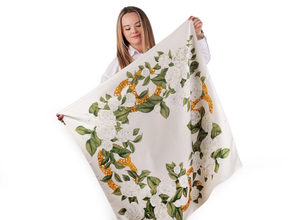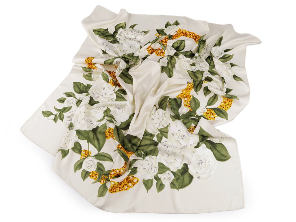 Velký saténový šátek s motivem růží využijete na každodenní nošení. Je lehounký a měkký, doslova vás bude hýčkat, protože na dotek připomíná hedvábí. Šátek můžete uvázat do slušivého uzlu, který podtrhne eleganci vašeho oděvu. Šátek je jednostranný.