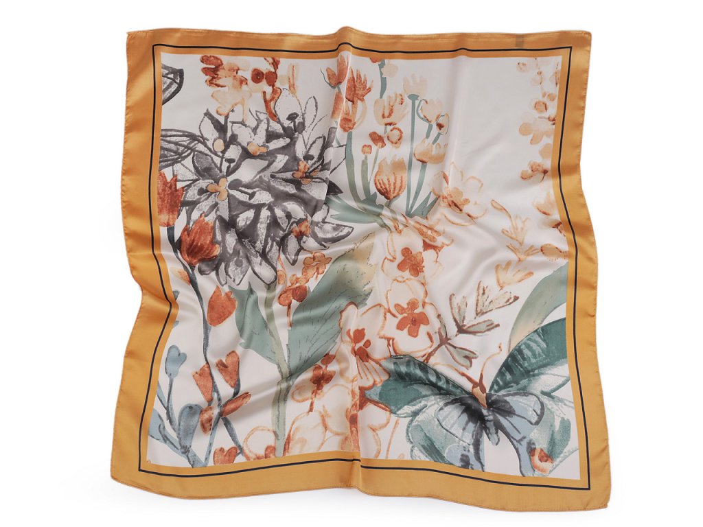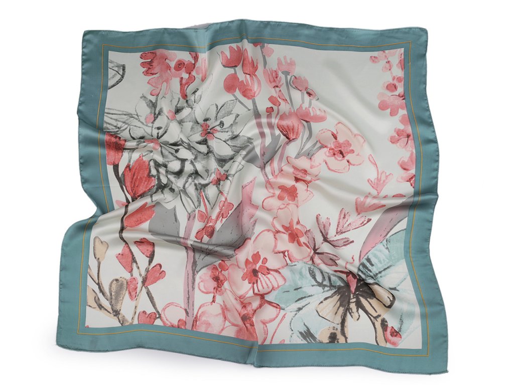 Saténový šátek s květy a motýlem využijete na každodenní nošení. Jeho příjemný materiál je hebký na dotek. Šátek můžete uvázat do slušivého uzlu, který podtrhne eleganci vašeho oděvu.