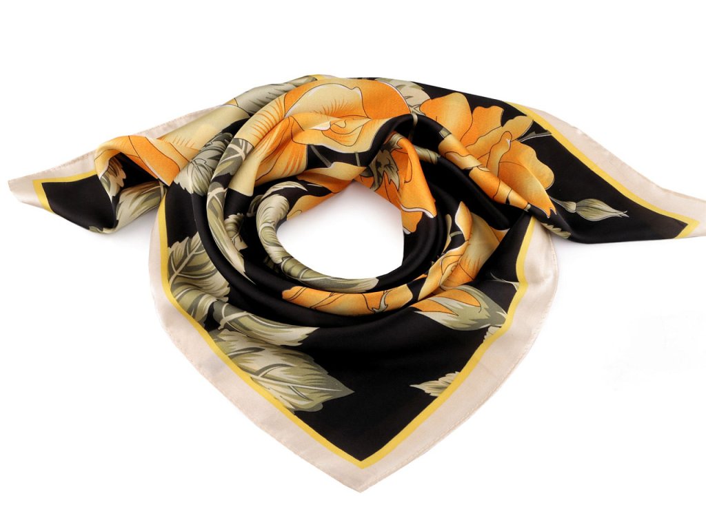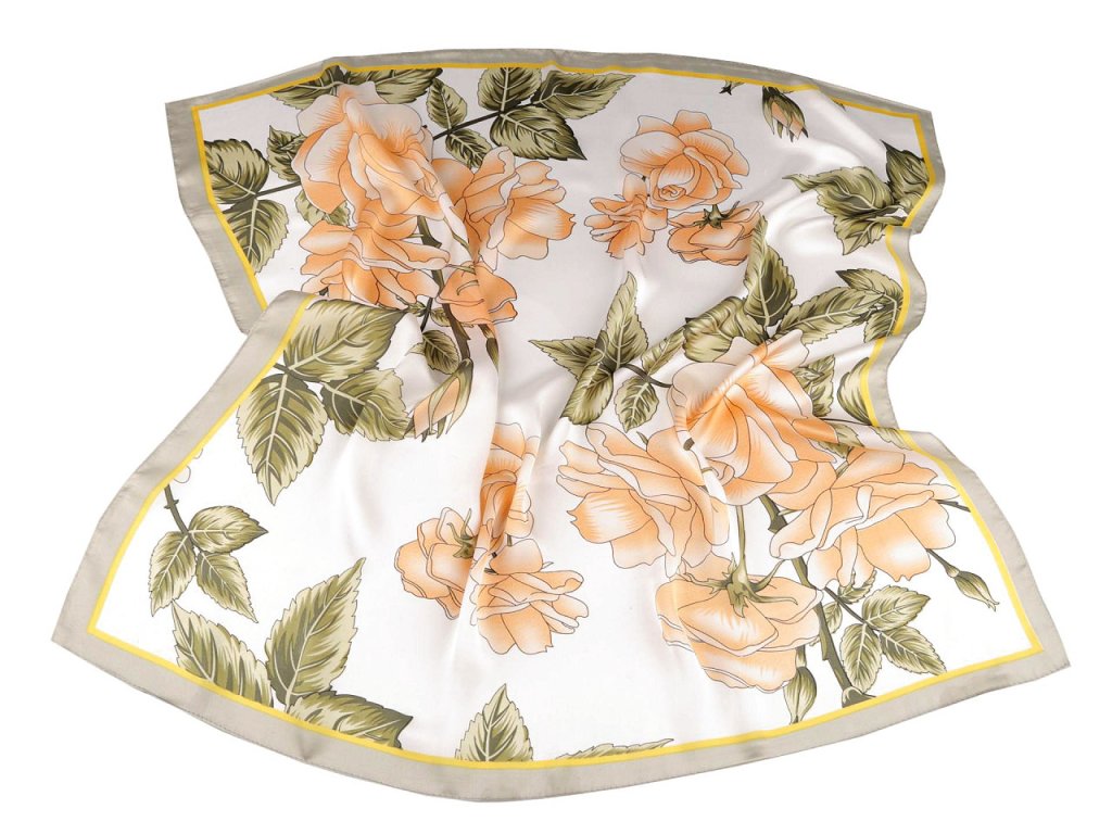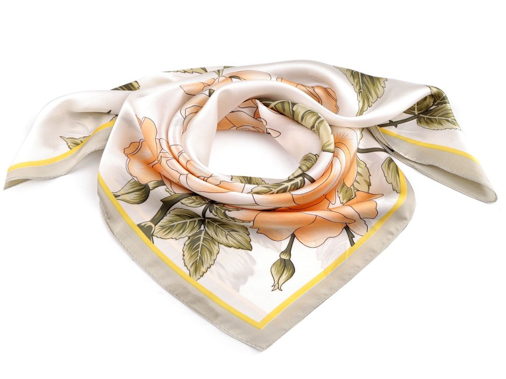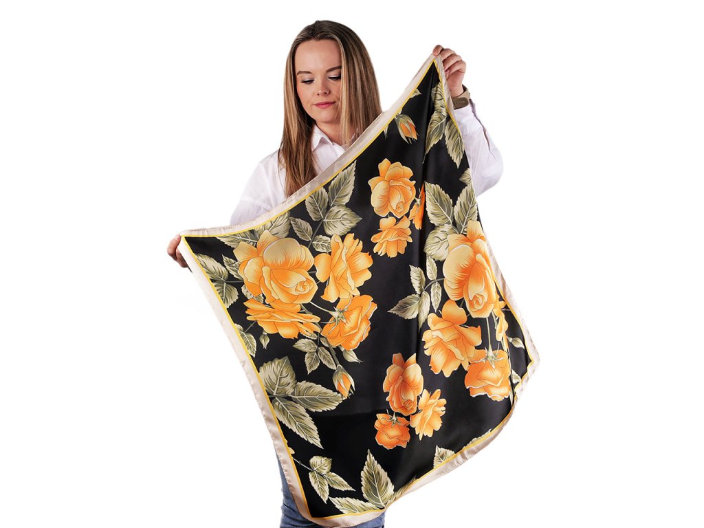 Saténový šátek s potiskem růží je velice kvalitní, elgantní, využijete jej na každodenní nošení. Jeho příjemný materiál vás bude doslova hýčkat, připomíná hedvábí. Můžete ho uvázat do slušivého uzlu, který podtrhne dokonalost vašeho oděvu. Šátek je jednostranný.