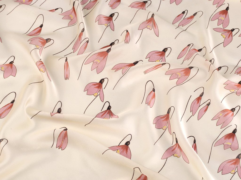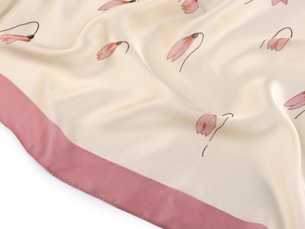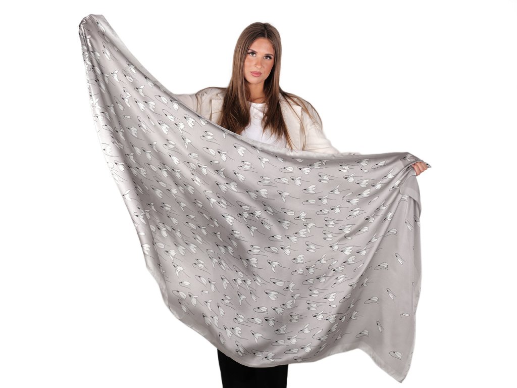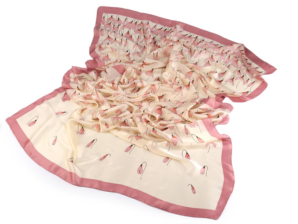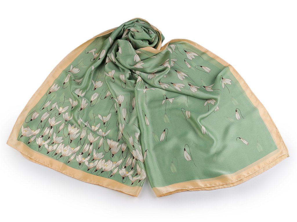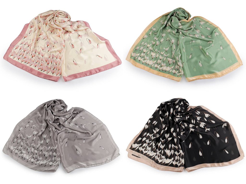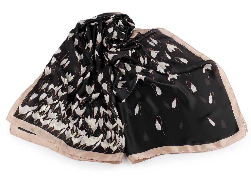 Elegantní saténová šála s květy je lehounká a měkká, na dotek připomíná hedvábí. Využijete ji do společnosti i na všední nošení ke kabátu, saku, halence, svetříku, šatům apod.