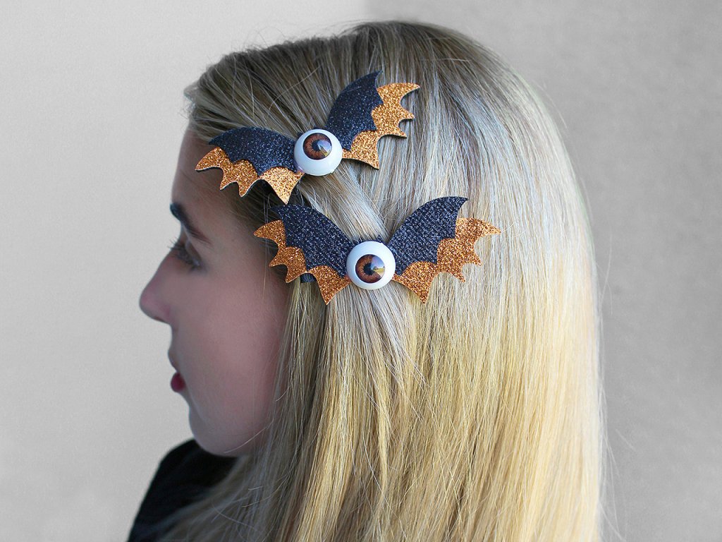 Jsou ozdobené plastovým okem a netopýřími křidýlky s glitry. Spony mají drobné zoubky, v účesu dobře drží. Nemusí se nosit jen ve vlasech, můžete si je ozdobně připnout na tašku, límeček košile, kravatu, využijete je i jako tématickou dekoraci.
