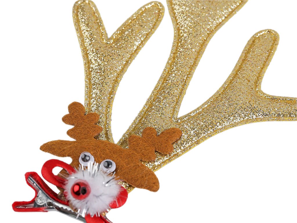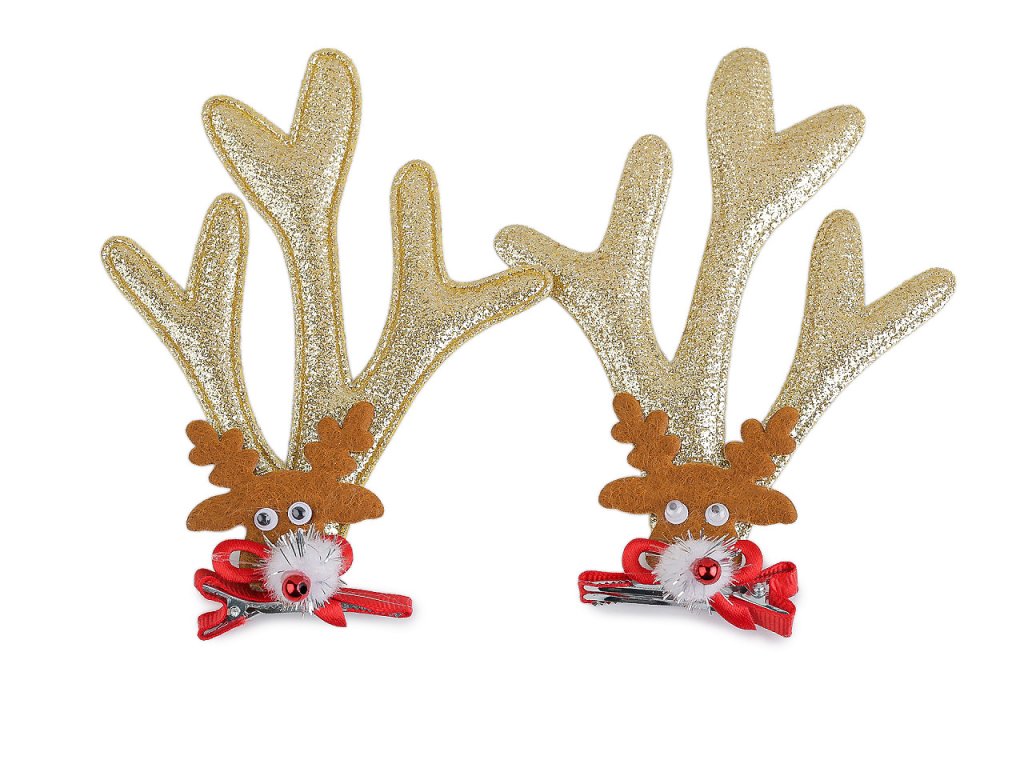 Sponky se sobíky potěší malé i velké slečny. Stanou se nepostradatelným doplňkem vánočních večírků a dalších zimních oslav. Na hlavě najdete pohyblivé plastové oči a zlaté třpytivé parůžky. Na čumáku je ozdoba z mašličky, lurexové bambulky a lesklého korálku. Spony mají zoubky, v účesu perfektně drží. Nemusí se nosit jen ve vlasech, můžete si je ozdobně připnout na tašku, jako zimní dekoraci apod.