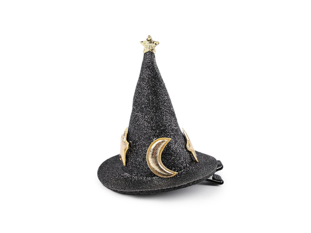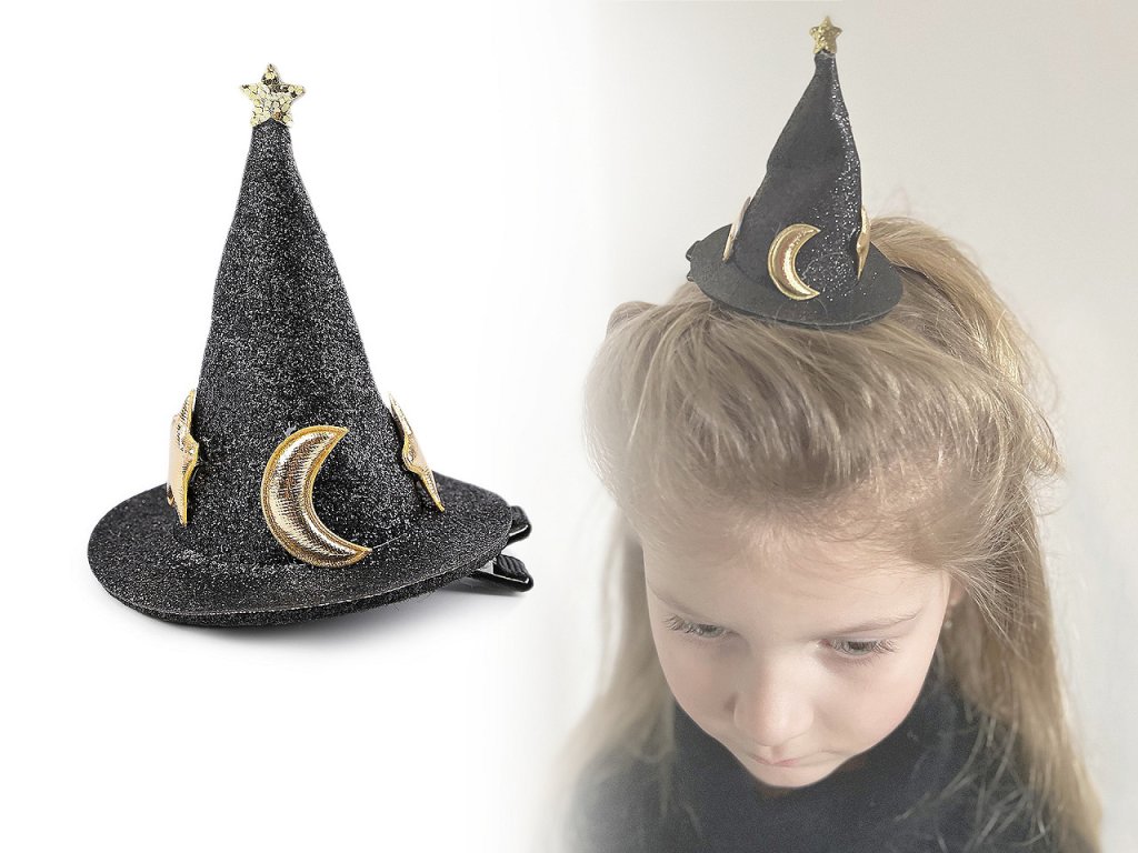 Spona s čarodějnickým kloboukem potěší malé i velké kouzelnice. Klobouk se díky glitrům jemně třpytí. Spona má zoubky, v účesu perfektně drží. Nemusí se nosit jen ve vlasech, můžete si ji ozdobně připnout na tašku, jako dekoraci na halloween apod.