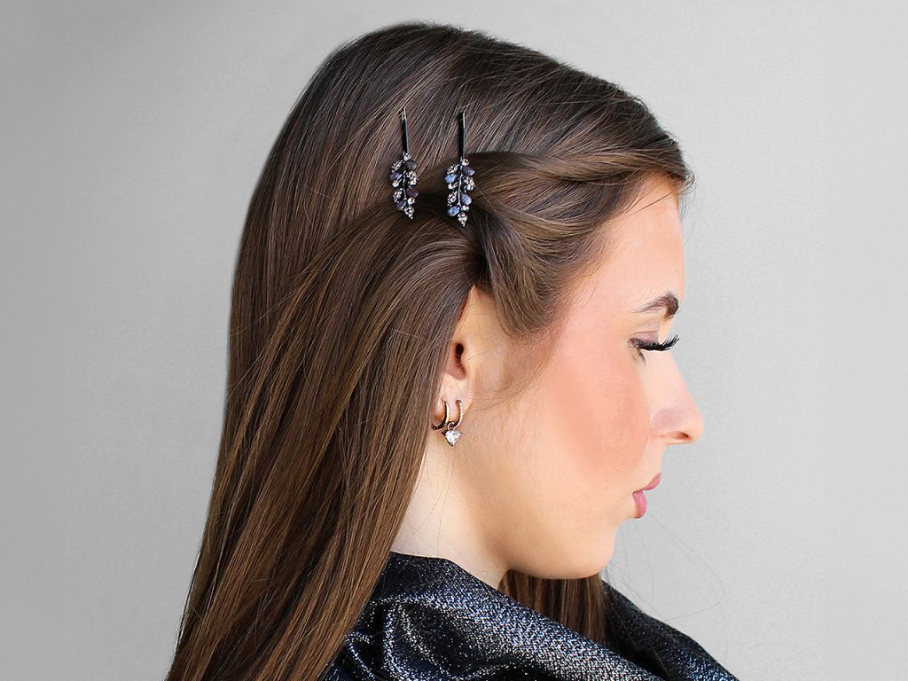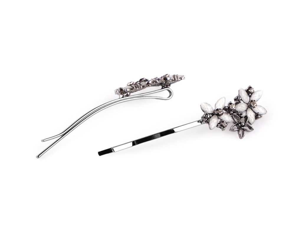 Elegantní sponky do vlasů zdobí lesklé broušené kamínky. Jsou vyrobené z kvalitního bižuterního kovu, ve vlasech výborně drží. Využijete je na různé společenské akce, ale také na běžné nošení, zajímavě ozdobí váš účes.