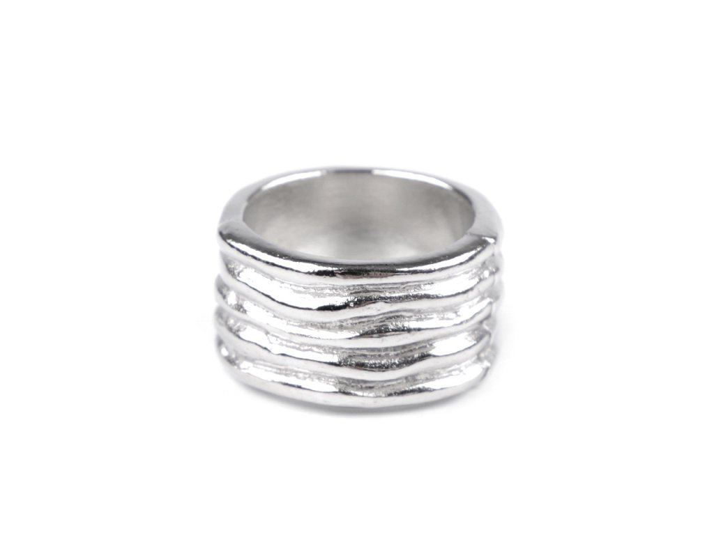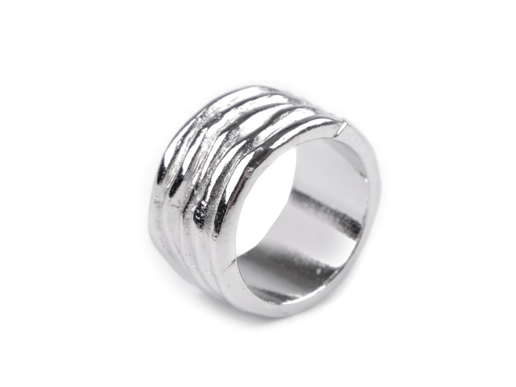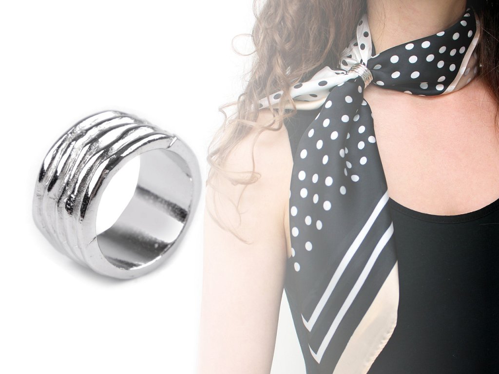 Elegantní kovový průvlek má tvar prstenu. Je ozdobený reliéfem zvlněných pruhů. Průvlek vypadá velice efektně v kombinaci s jemným šátkem.