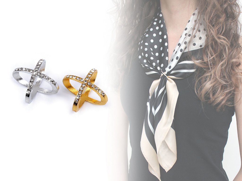 Elegantní spona z kroužků se používá na rychlé sepnutí šátku. Zdobí ji broušené kamínky, které se efektně třpytí. Vypadá skvěle v kombinaci s jemným šátkem.
