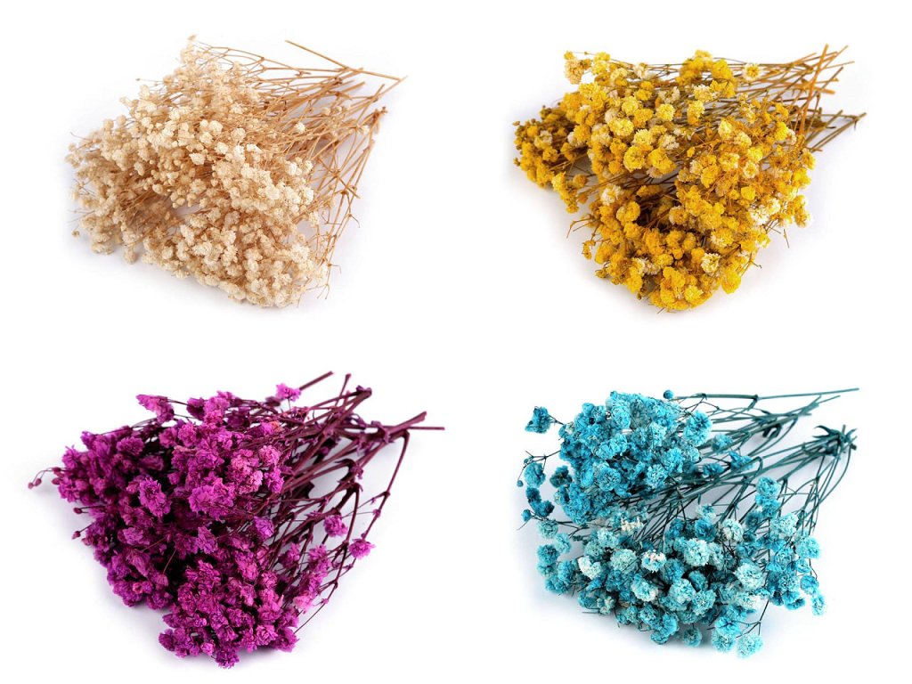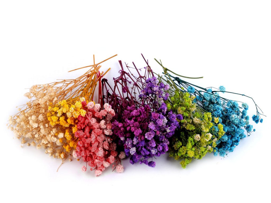 Sušené / stabilizované květy drobného šateru působí jemně a křehce. Dekoracím dodají romantický nádech, především těm svatebním. Využijete je na různá aranžmá, ikebany, sušené vazby, voničky, ale můžete je zakomponovat i do dárkových balení, třeba ke kosmetice či svíčkám. Jsou vhodné na suché i mokré aranžování.