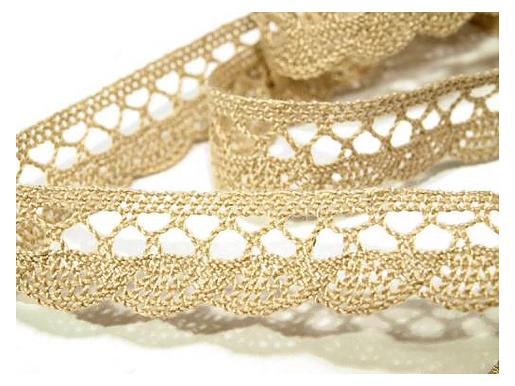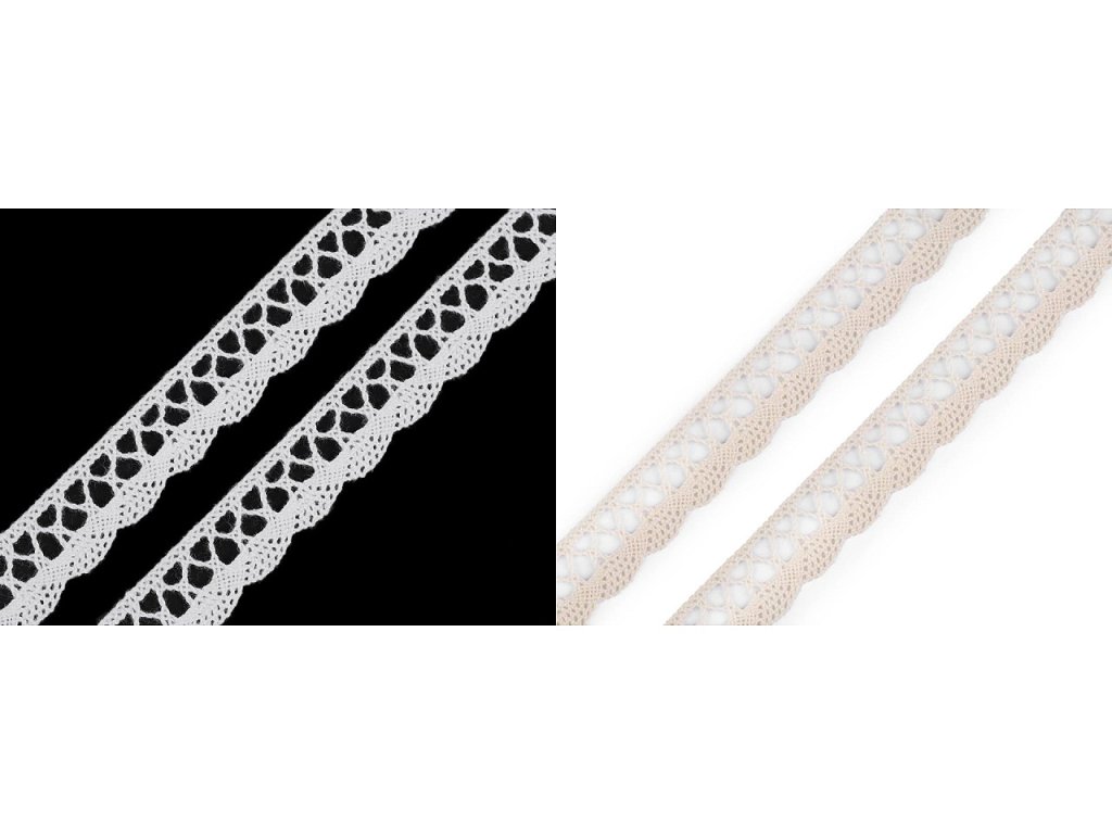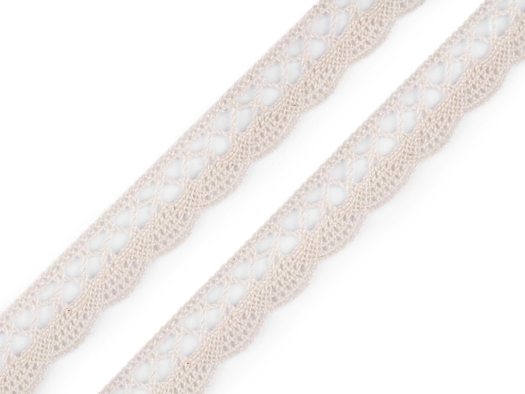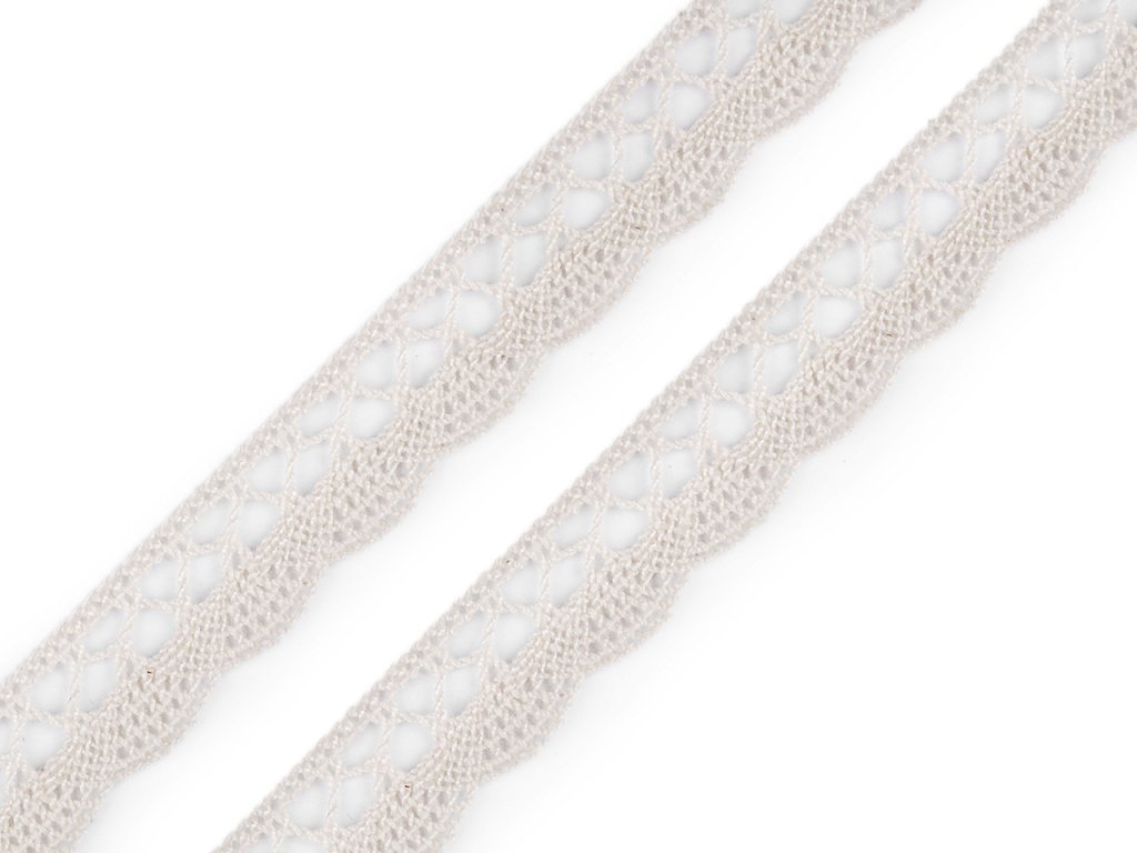 Bavlněná paličkovaná krajka je zdobena malými očky a zakončena jemnými vlnkami. Doporučujeme ji žehlit přes tkaninu.