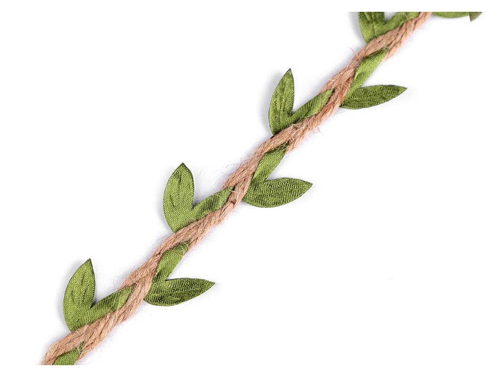 Jutový prýmek s lístečky je vhodný k šití i k dekorování. Stuha s listy je do prýmku zapletena, tím zajišťuje pravidelnost. Listy mají uprostřed vytlačené žilkování.