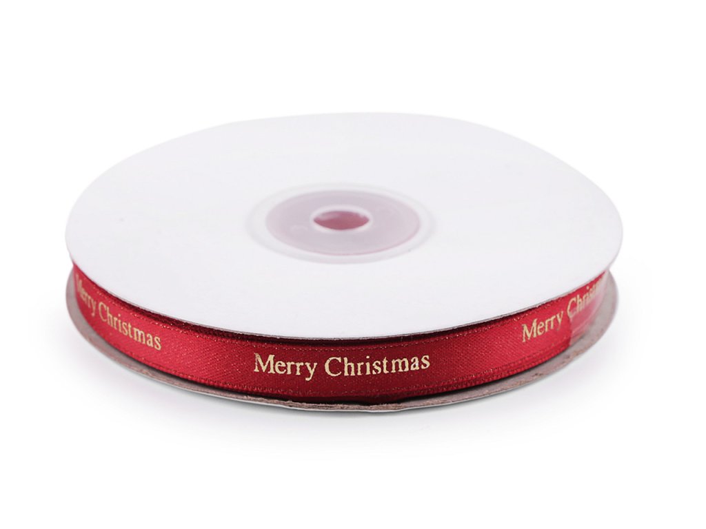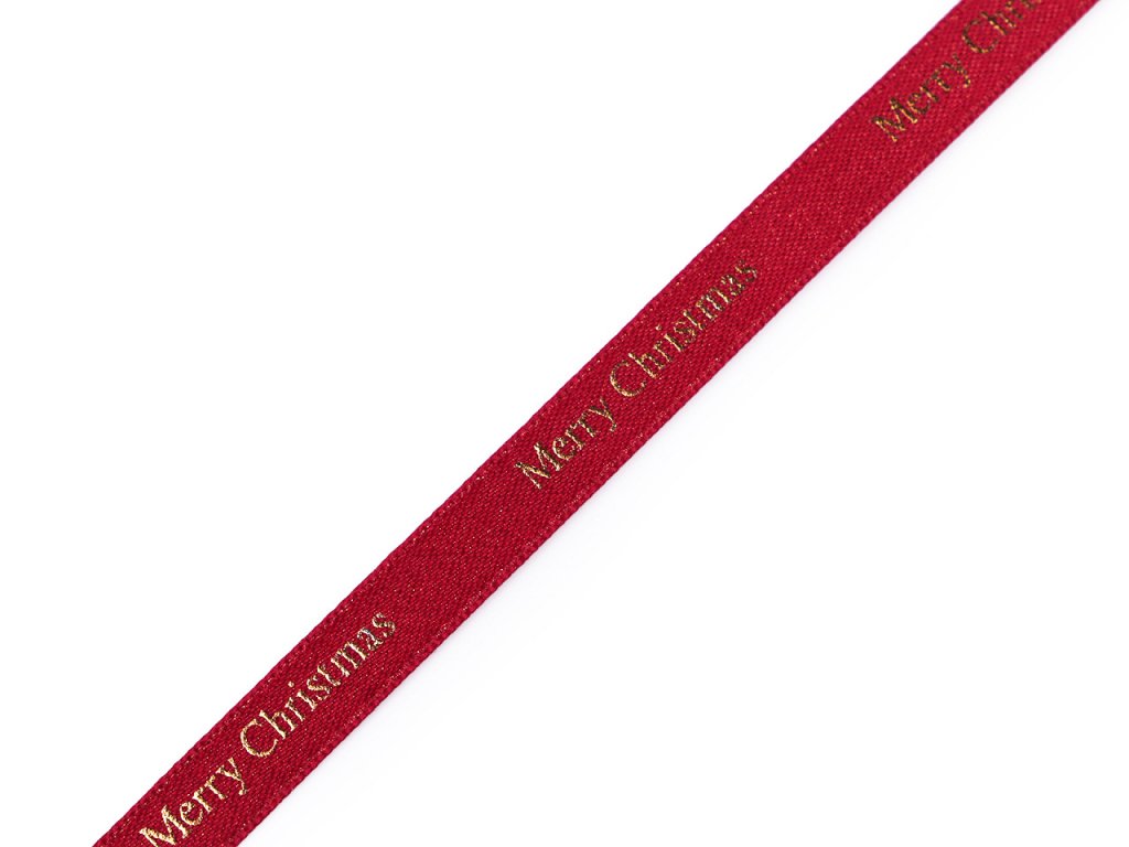 Dekorační stuha je ozdobená metalickým potiskem s nápisem "Merry Christmas". Potisk je jednostranný, stuha se jemně třpytí.