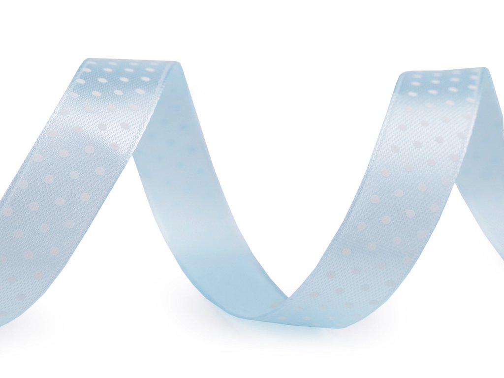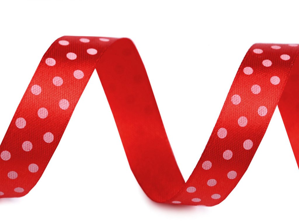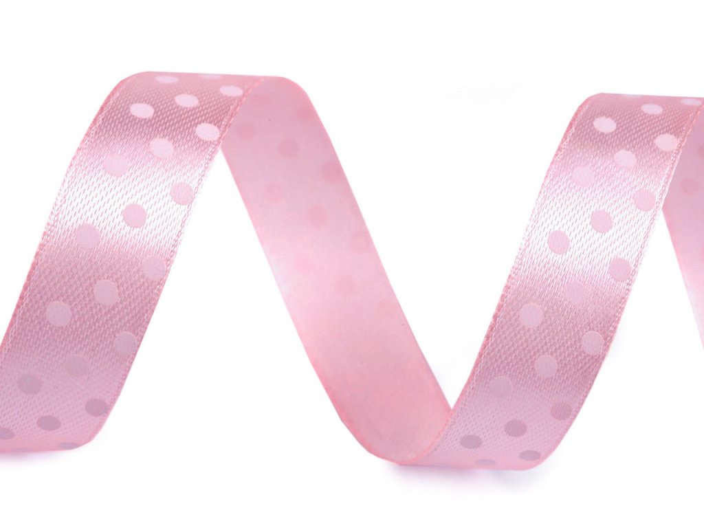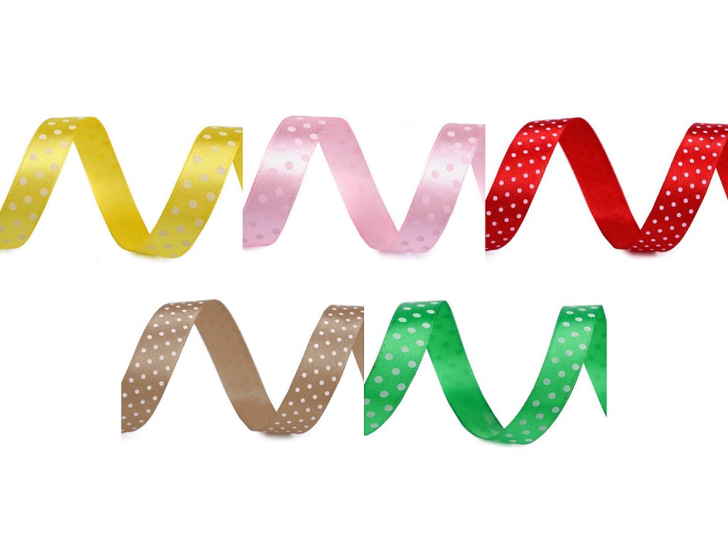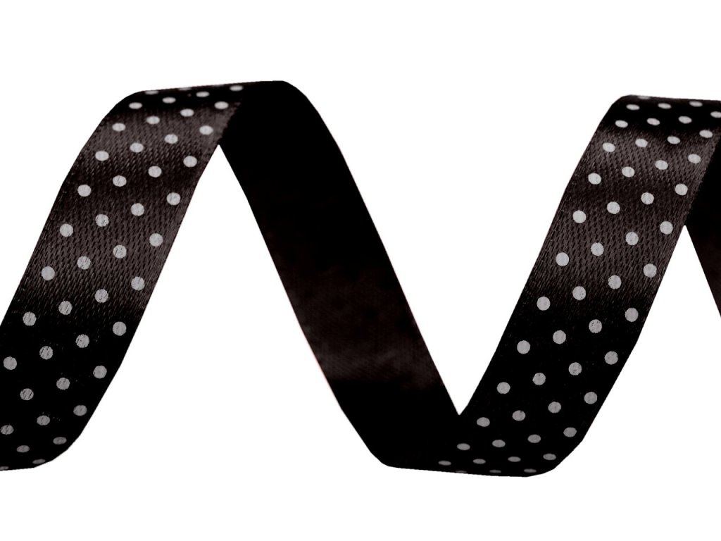 Saténová stuha je zdobena puntíky, které působí veselým a hravým dojmem. Je pevná, jednostranná.