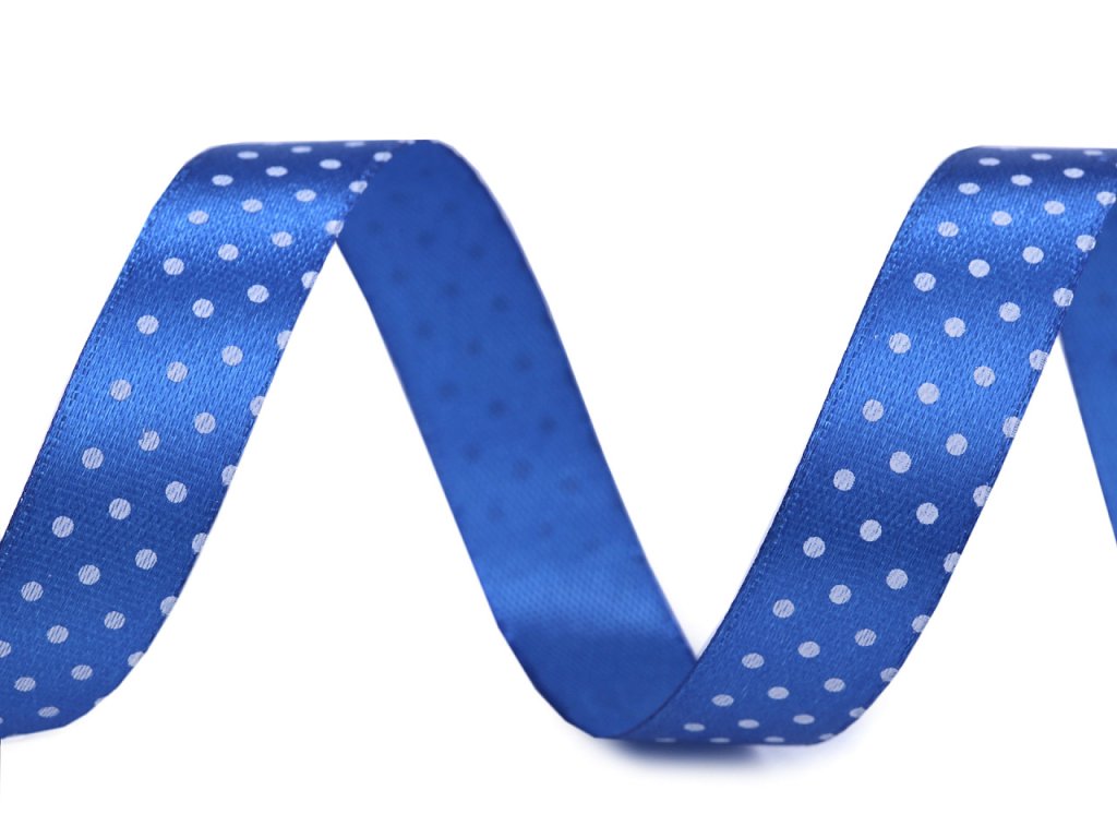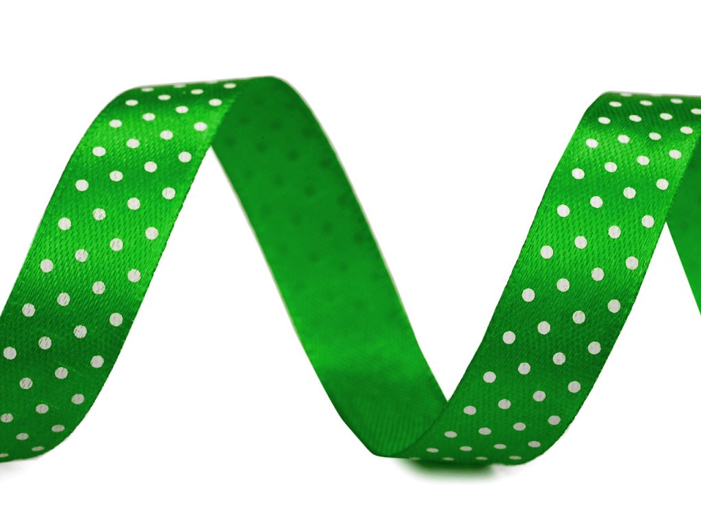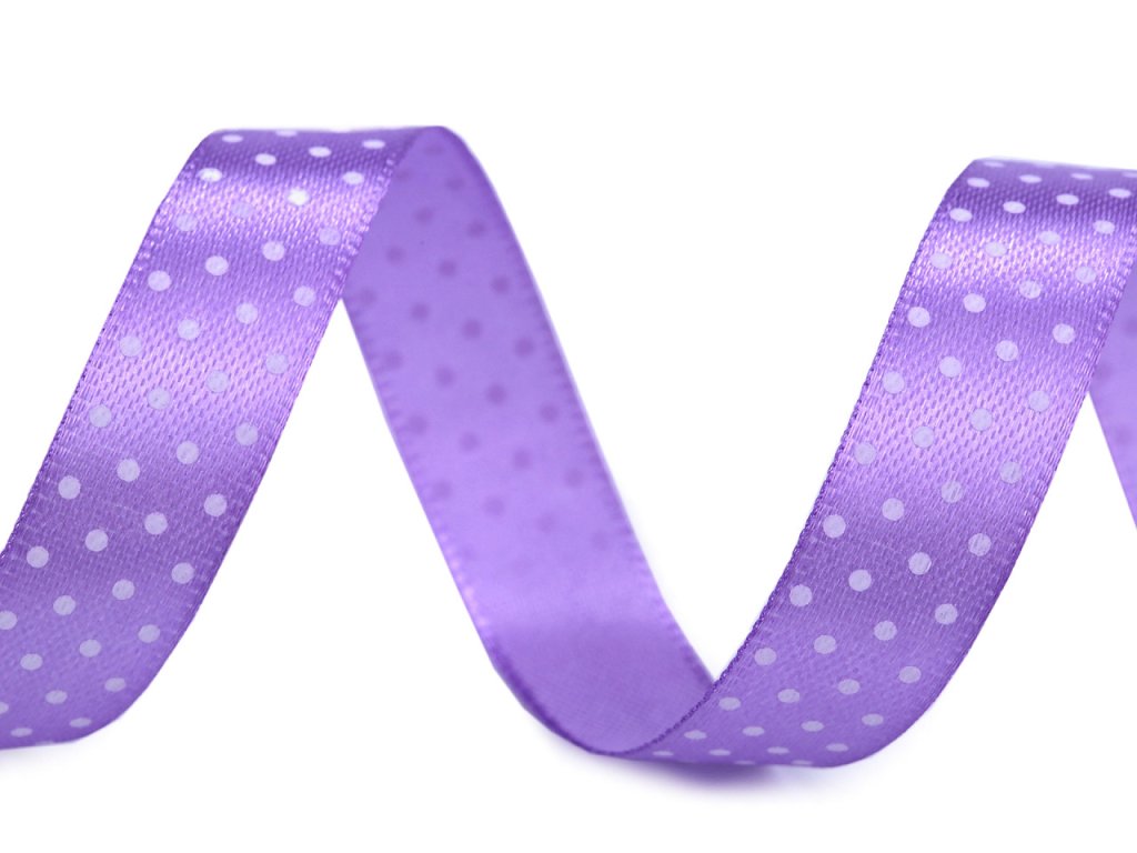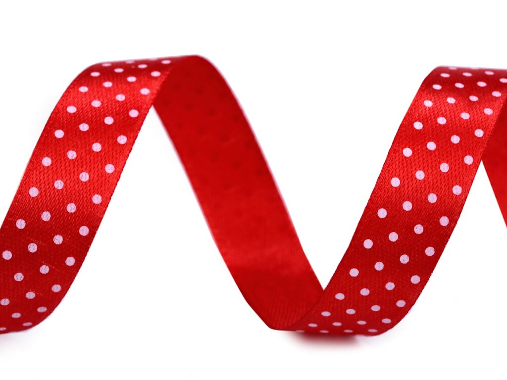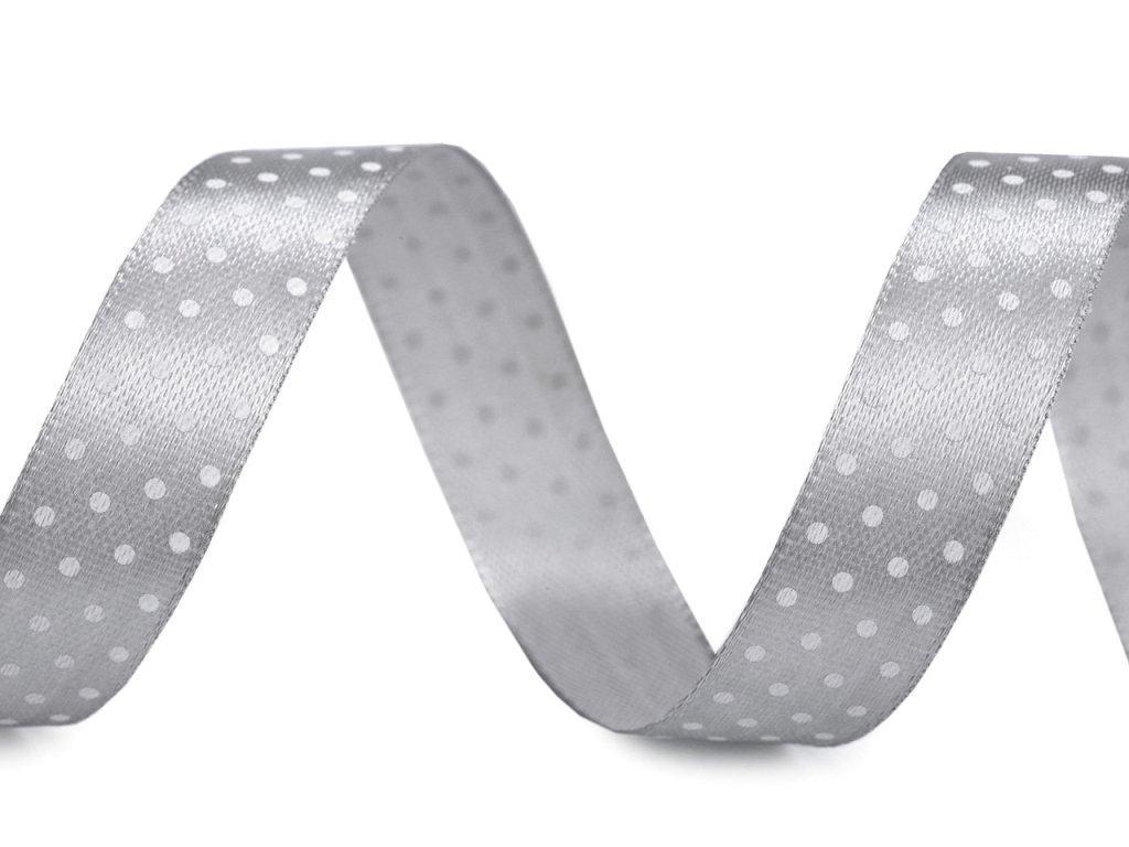 Saténová stuha je zdobena puntíky, které působí veselým a hravým dojmem. Je pevná, jednostranná.