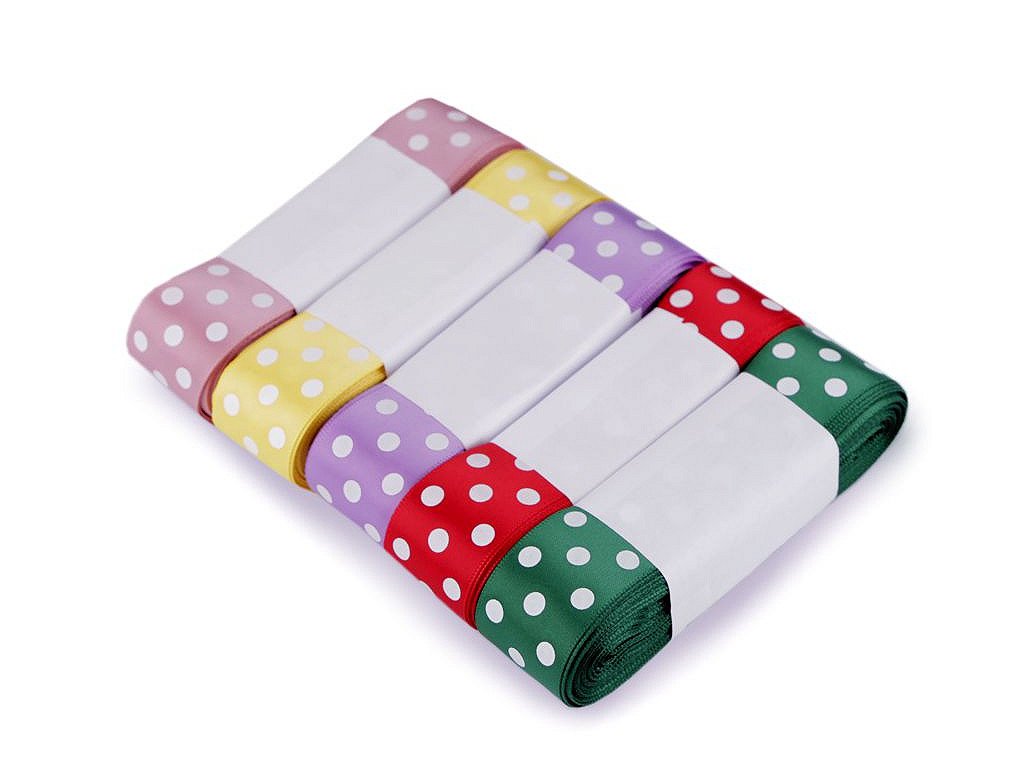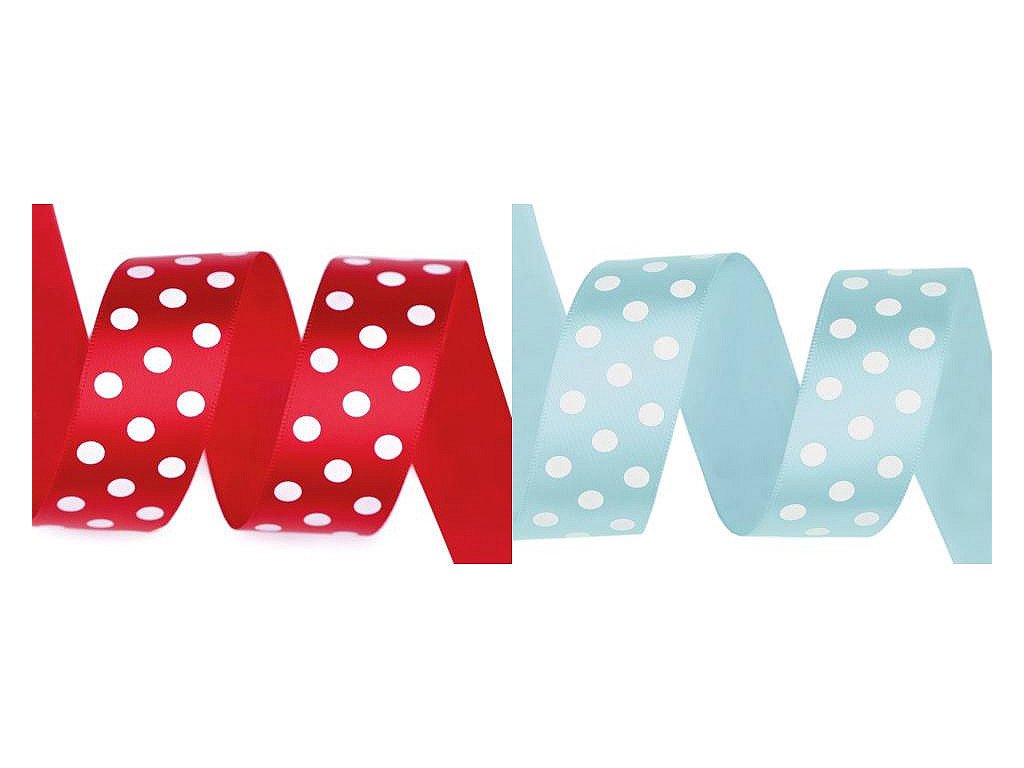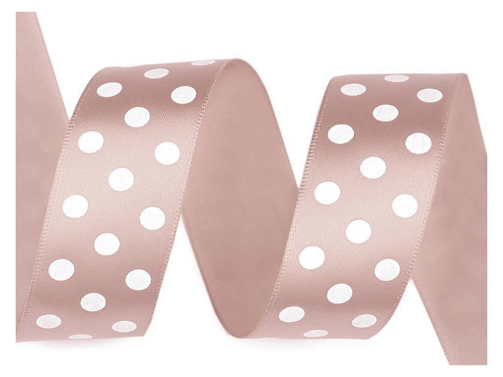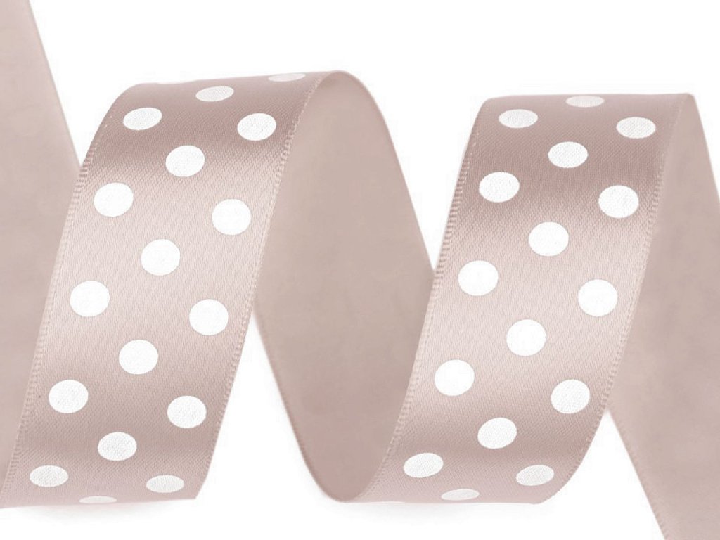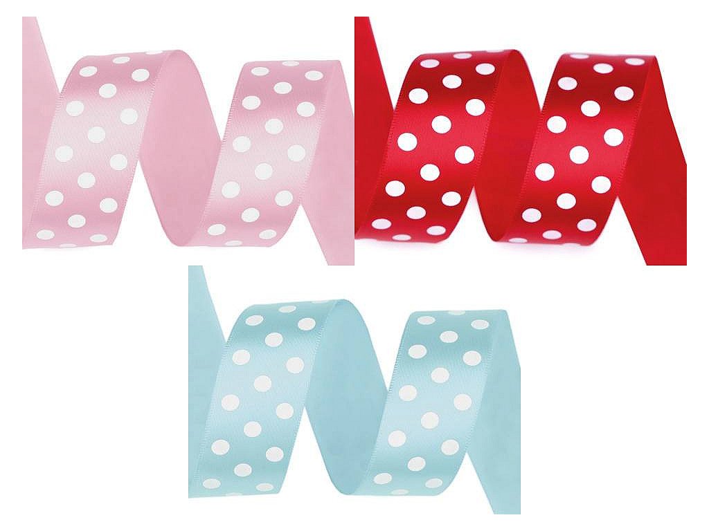 Saténovou stuhu zdobí potisk puntíků, který je jednostranný. Její povrch se jemně leskne.