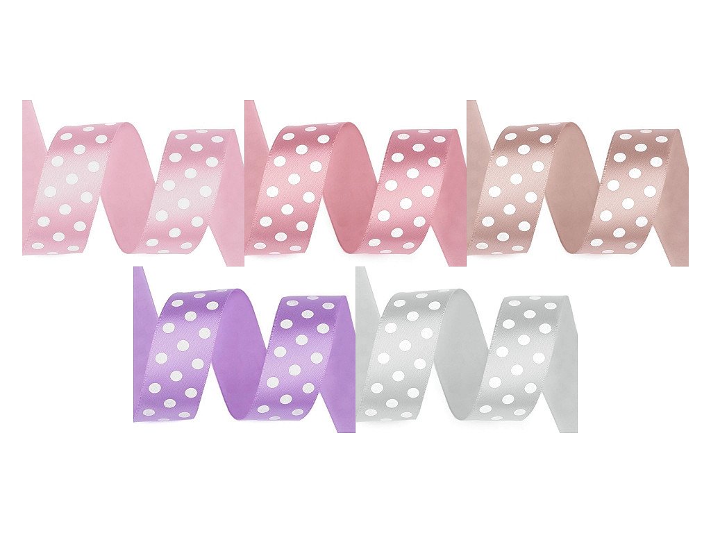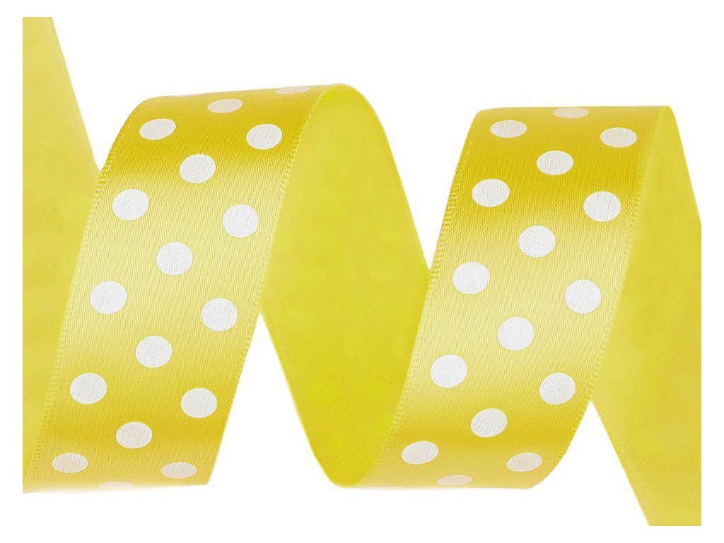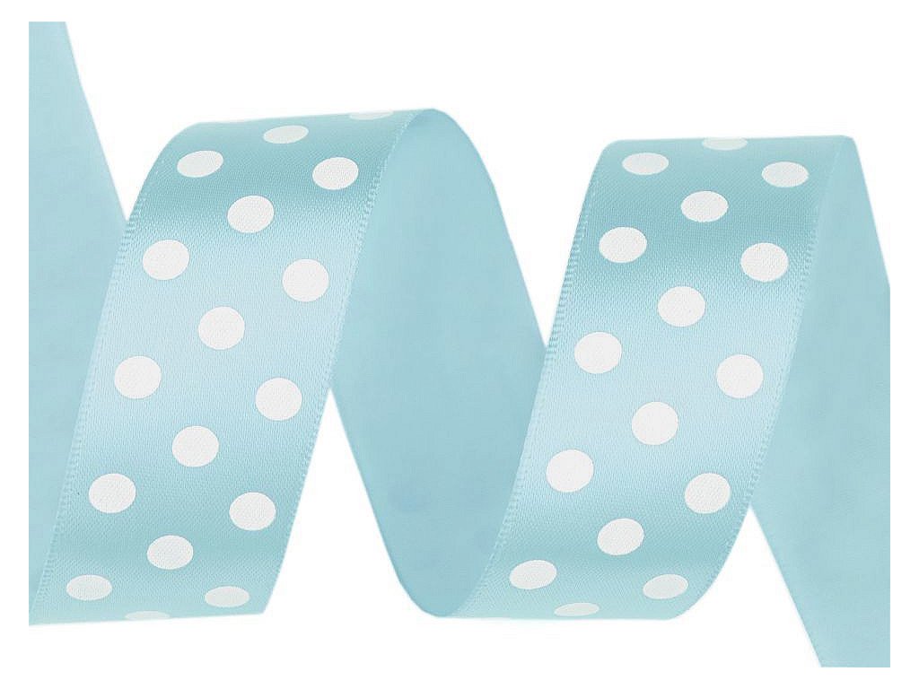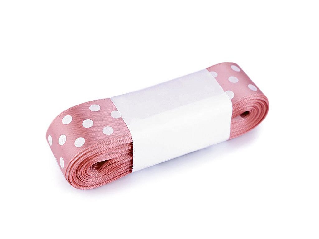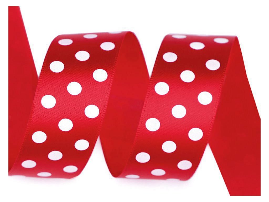 Saténovou stuhu zdobí potisk puntíků, který je jednostranný. Její povrch se jemně leskne.