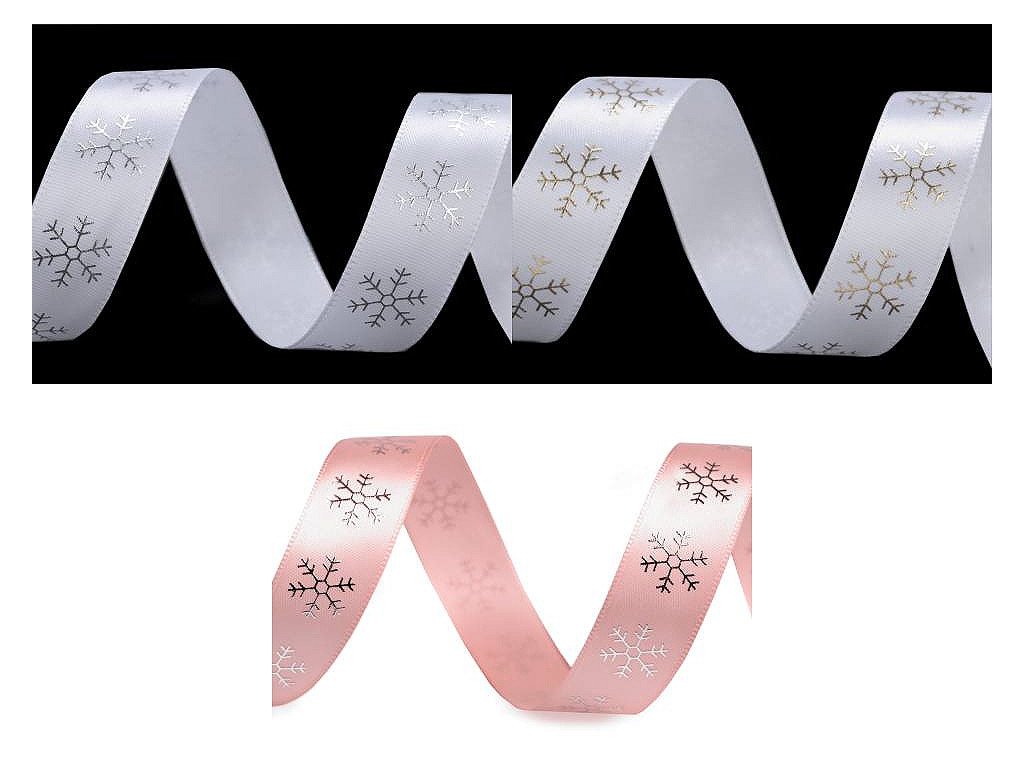 Dekorační saténová stuha s potiskem sněhových vloček. Potisk je jednostranný, metalický, připomíná lurex.