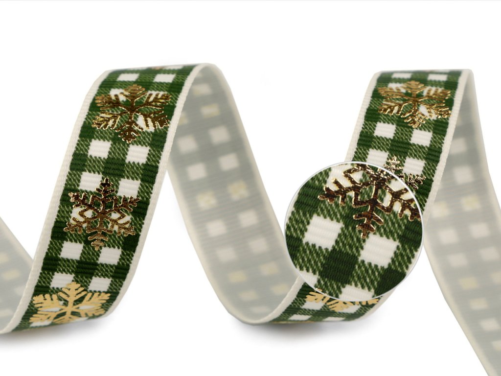 Dekorační rypsová stuha s motivem kára a metalickým potiskem vloček je velice kvalitní. Na povrchu má typické jemné žebrování. Potisk je jednostranný.