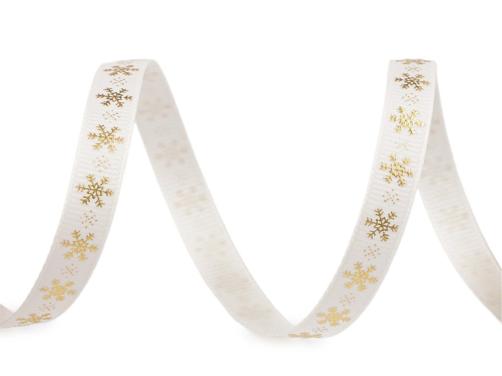 Dekorační rypsová stuha s metalickým potiskem vloček je pevná, na povrchu má typické jemné žebrování. Elegantní design vloček přináší pocit zimních svátků. Potisk je jednostranný.