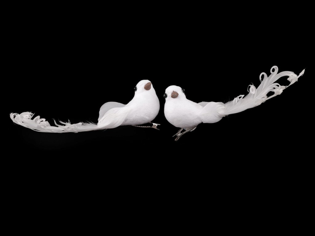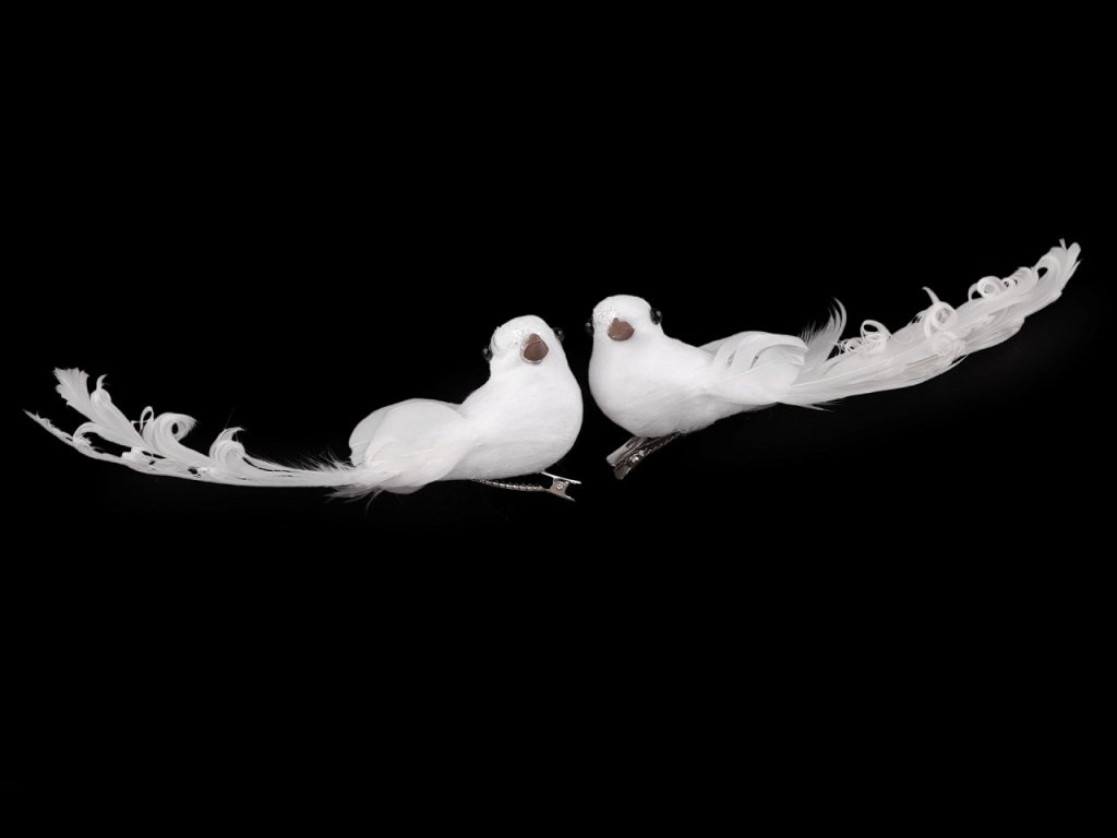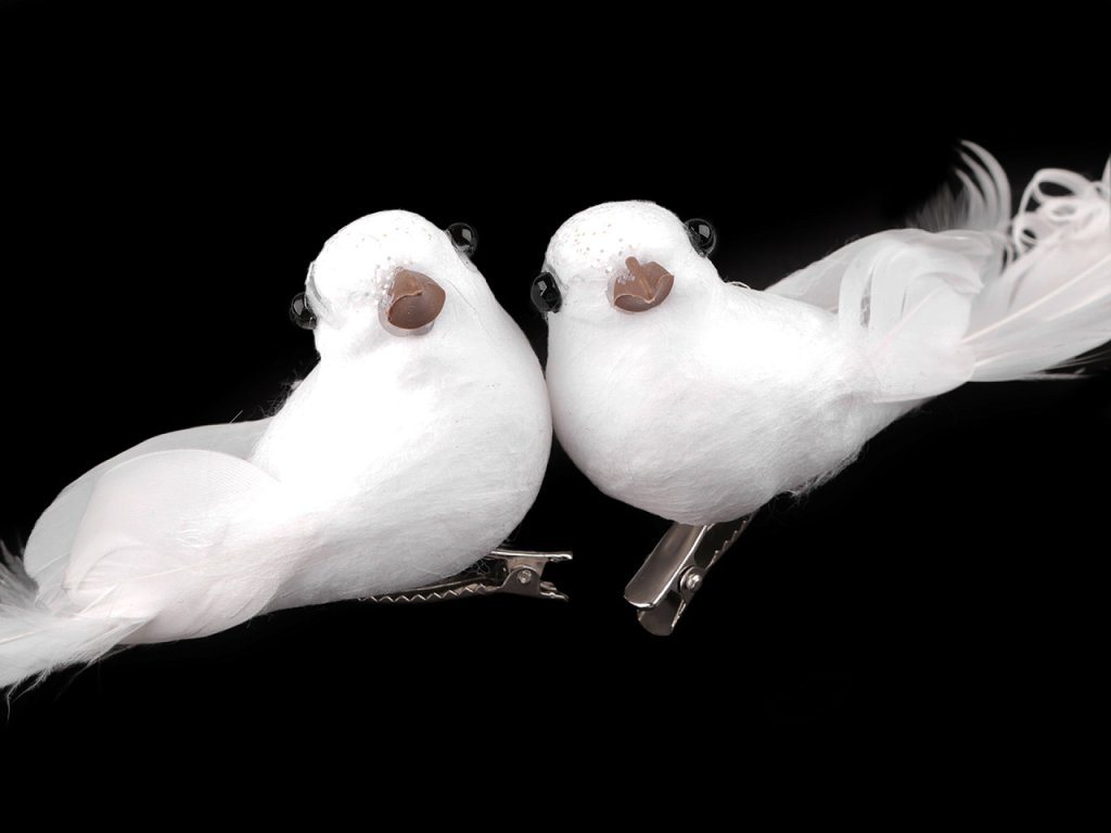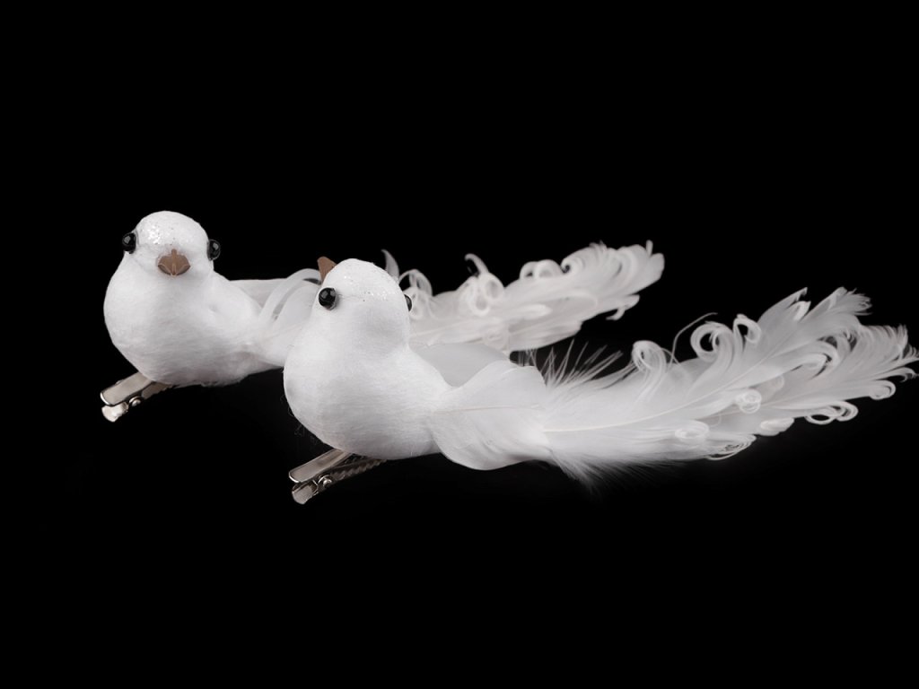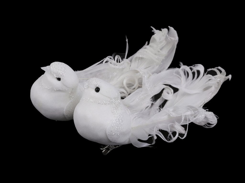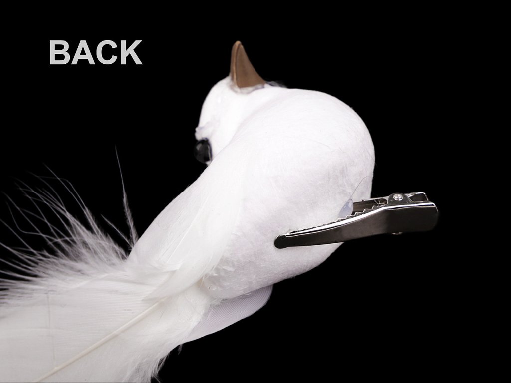 Dekorační holubici zdobí působivá kudrnatá peříčka. Zespodu má připevněnou kovovou sponu, díky které ji můžete připevnit například na věnec, větvičku, záclonu či ji naaranžovat do květinových vazeb. Hodí se ke svatebnímu i vánočnímu aranžování.