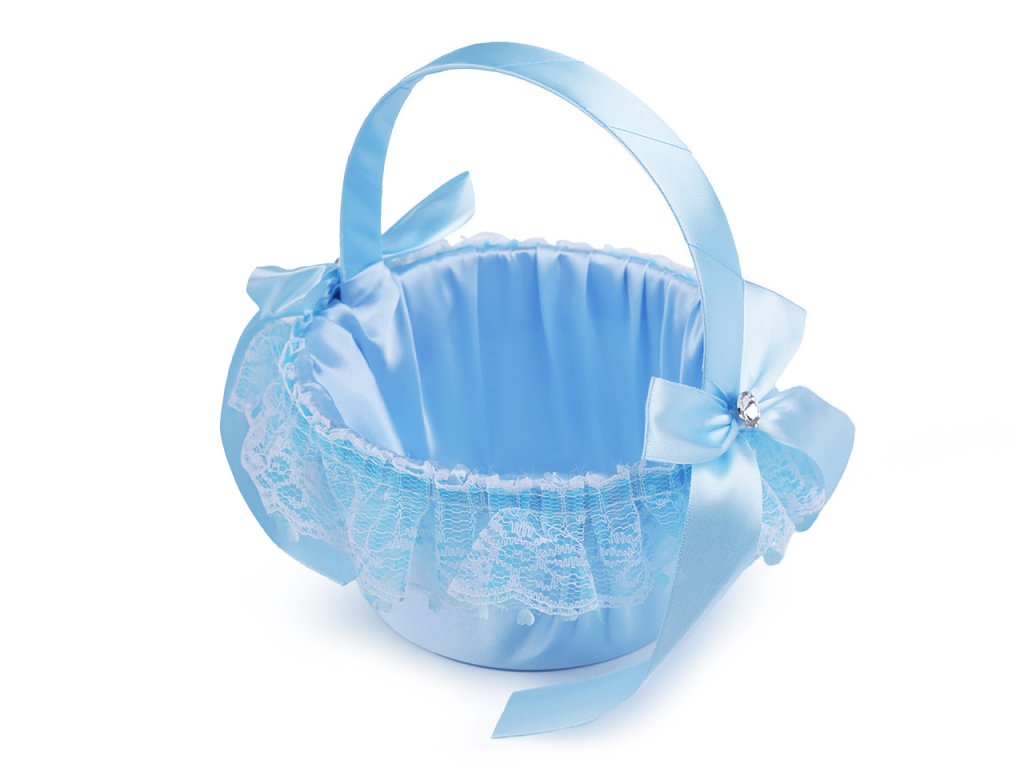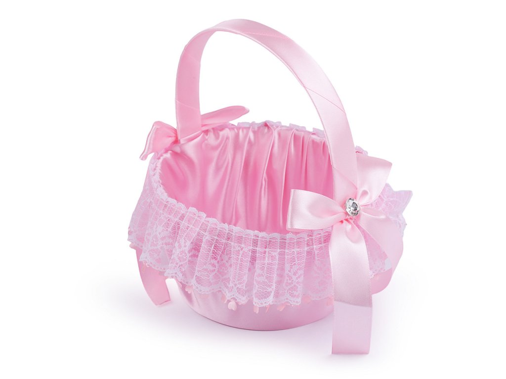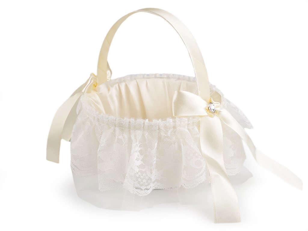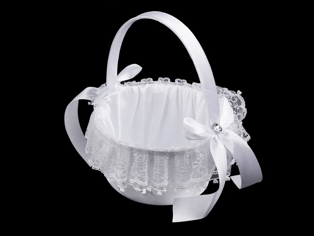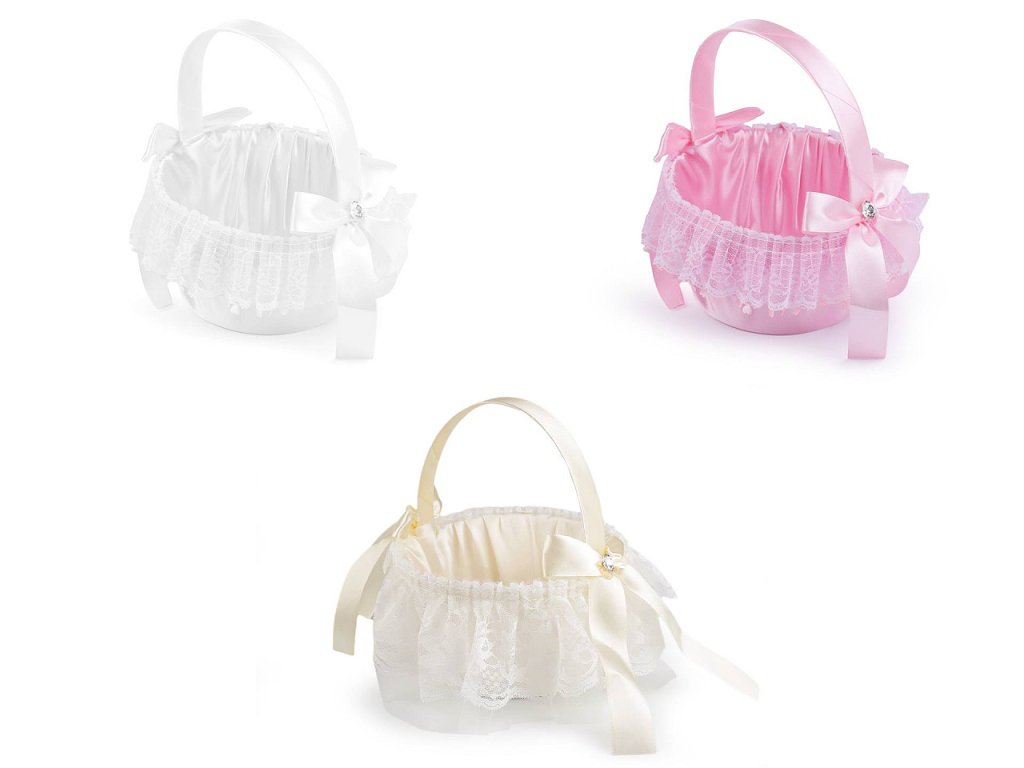 Saténový svatební košíček je jako třešnička na dortu pro všechny družičky. Uvnitř se budou vyjímat plátky růží nebo květinová aranžmá. Košíček je vyrobený z pevnějšího plastu. Zdobí ho mašličky ze saténové stuhy, broušené kamínky a krajka.