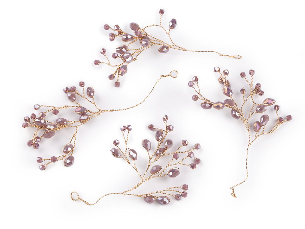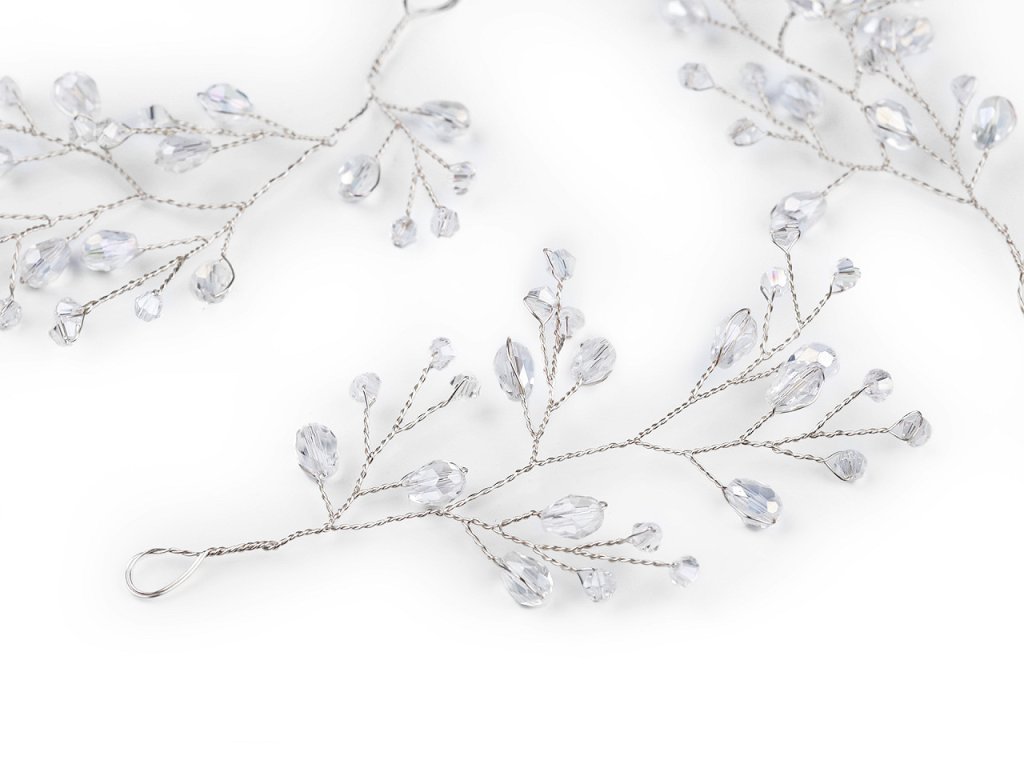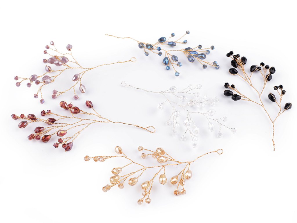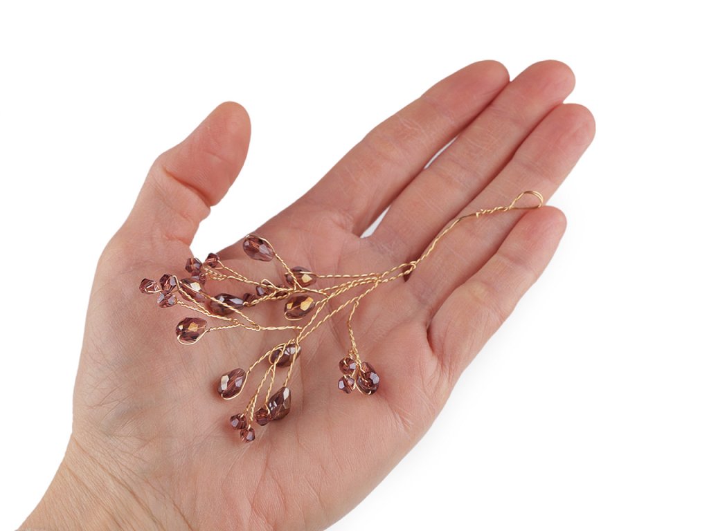 Větvičku s broušenými korálky využijete jako úchvatnou svatební i vánoční ozdobu. Korálky mají povrchovou úpravu s AB efektem, nádherně se třpytí. Větvičku můžete zakomponovat do věnců, svícnů nebo květinových vazeb. Na konci má očko, dá se i zavěsit. Vynikne také volně položená na sváteční tabuli. Hodí se i k výrobě fascinátorů, korunek, věnečků a jiných vlasových doplňků, díky drátkům ji můžete lehce tvarovat.