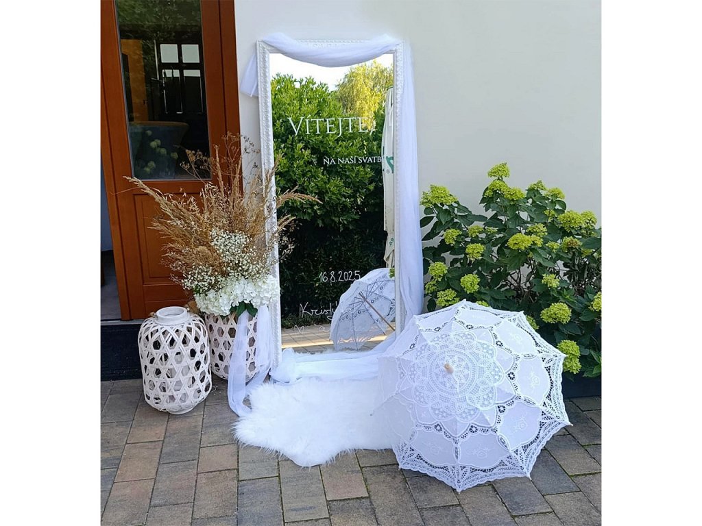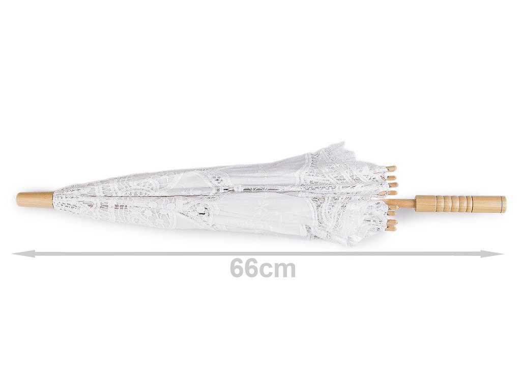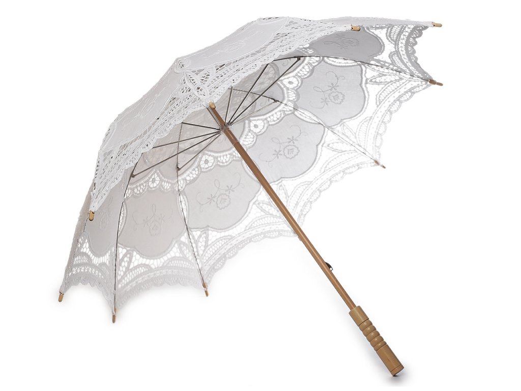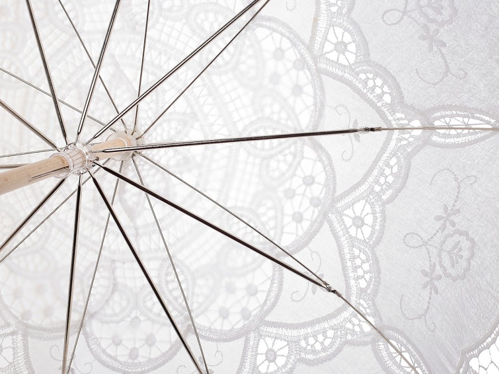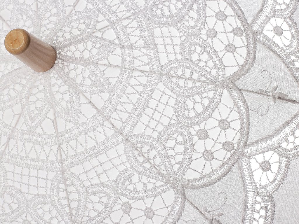 Romantický krajkový deštník, kde se jemná krajka prolíná s bavlněným vyšívaným plátnem v nádherných, propracovaných vzorech. Hodí se pro nevěsty v jejich svatební den, na zahradní slavnosti i pro romantické focení v exteriéru nebo ateliéru. Můžete jej v případě hezkého počasí využít jako doplněk při focení. Není vhodný do deště.