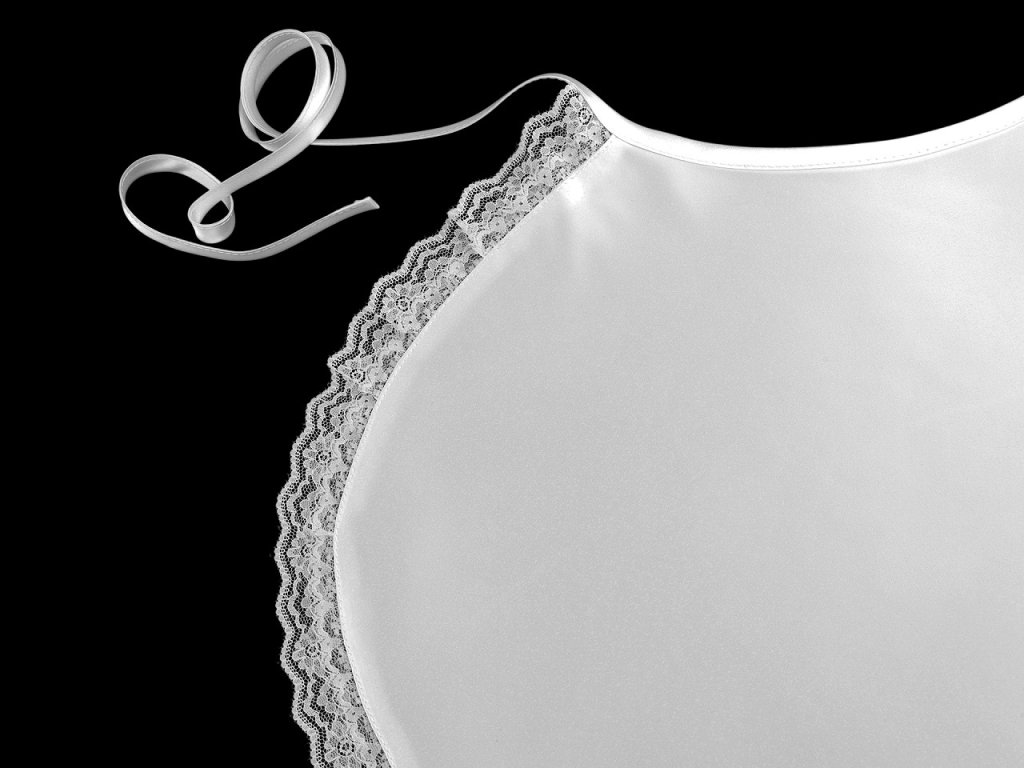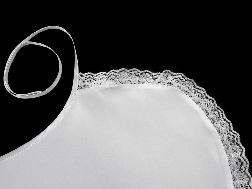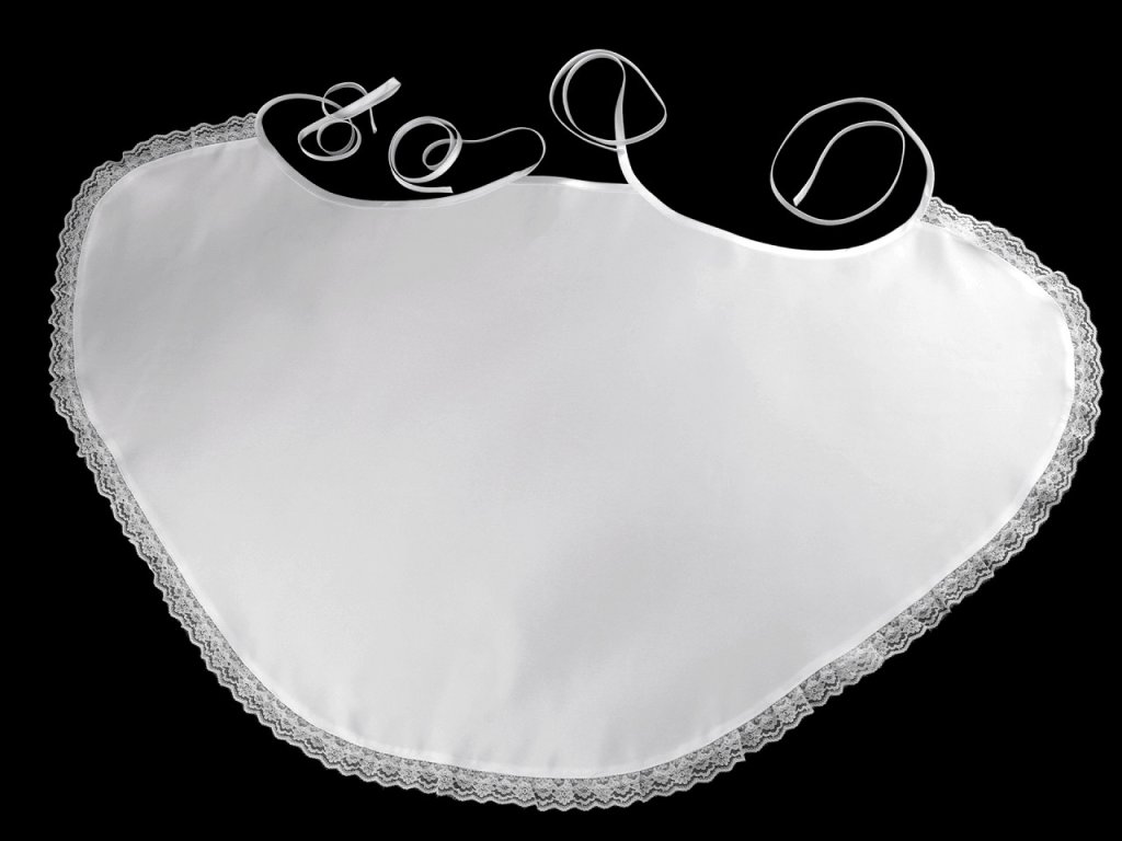 Saténový svatební bryndák ocení novomanželé při prvním společném obědě. Lemuje ho jemná romantická krajka. Bryndák můžete ještě dozdobit dle svého vkusu.