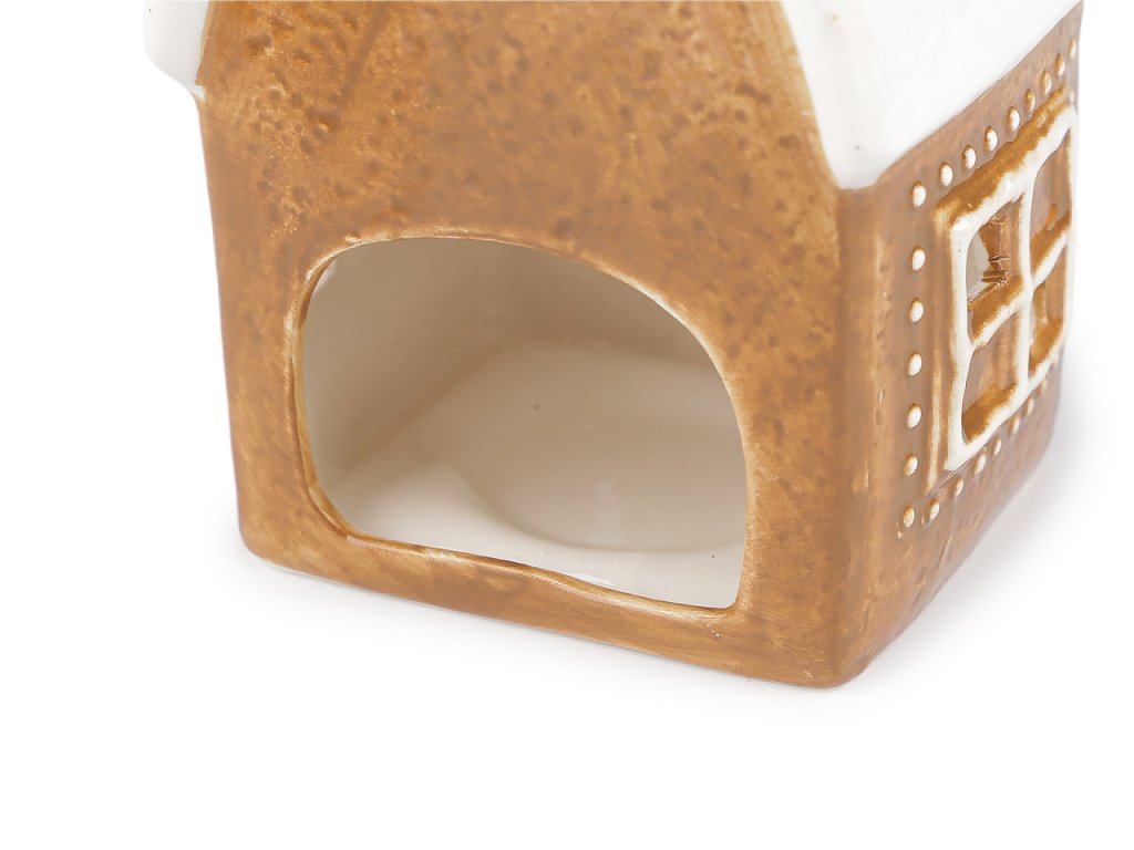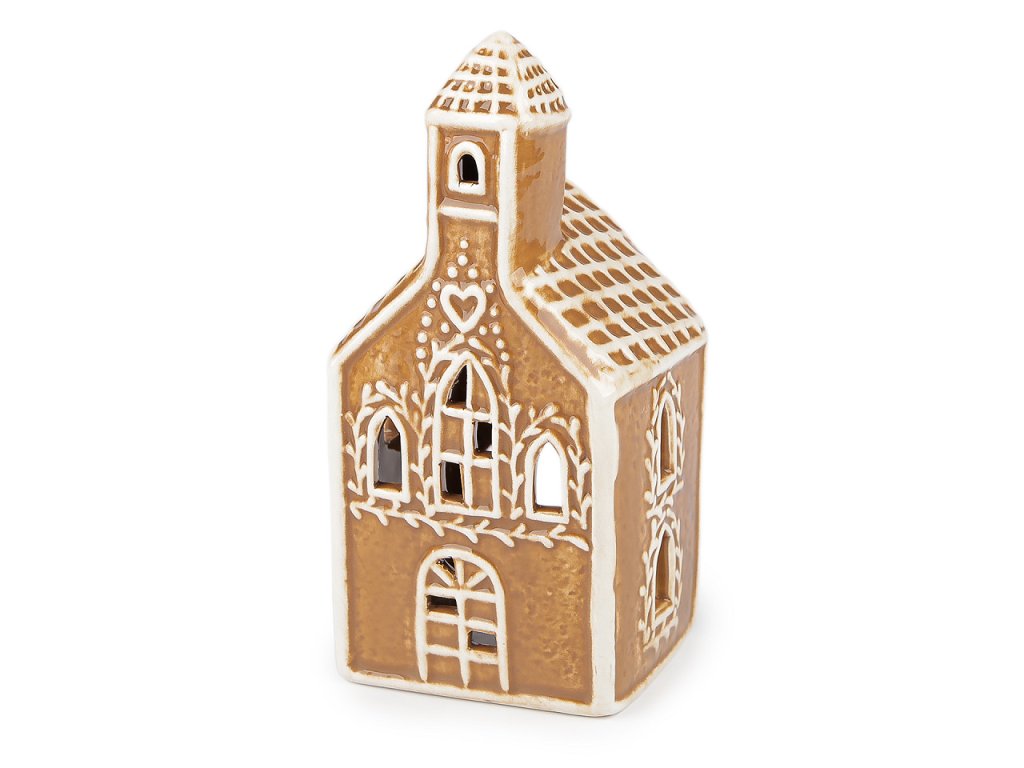 Keramický svícen ve tvaru chaloupky či kostela vnese do vašeho domova příjemnou a relaxační atmosféru. Svým designem imituje perník. Je vhodný na klasické čajové nebo LED čajové svíčky. Perfektně vynikne jako ozdoba vánočního stolu, okenního parapetu či jako součást svátečního aranžmá.