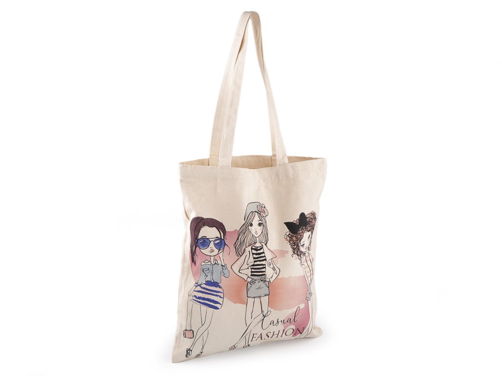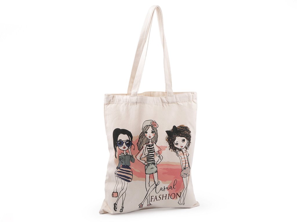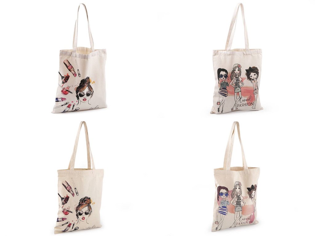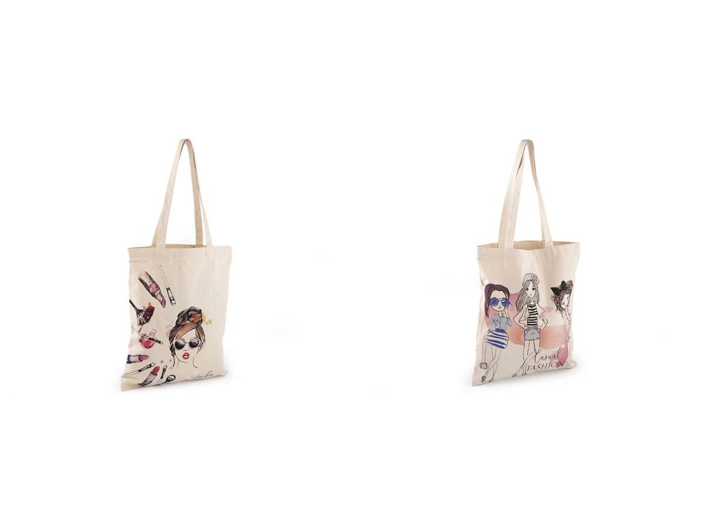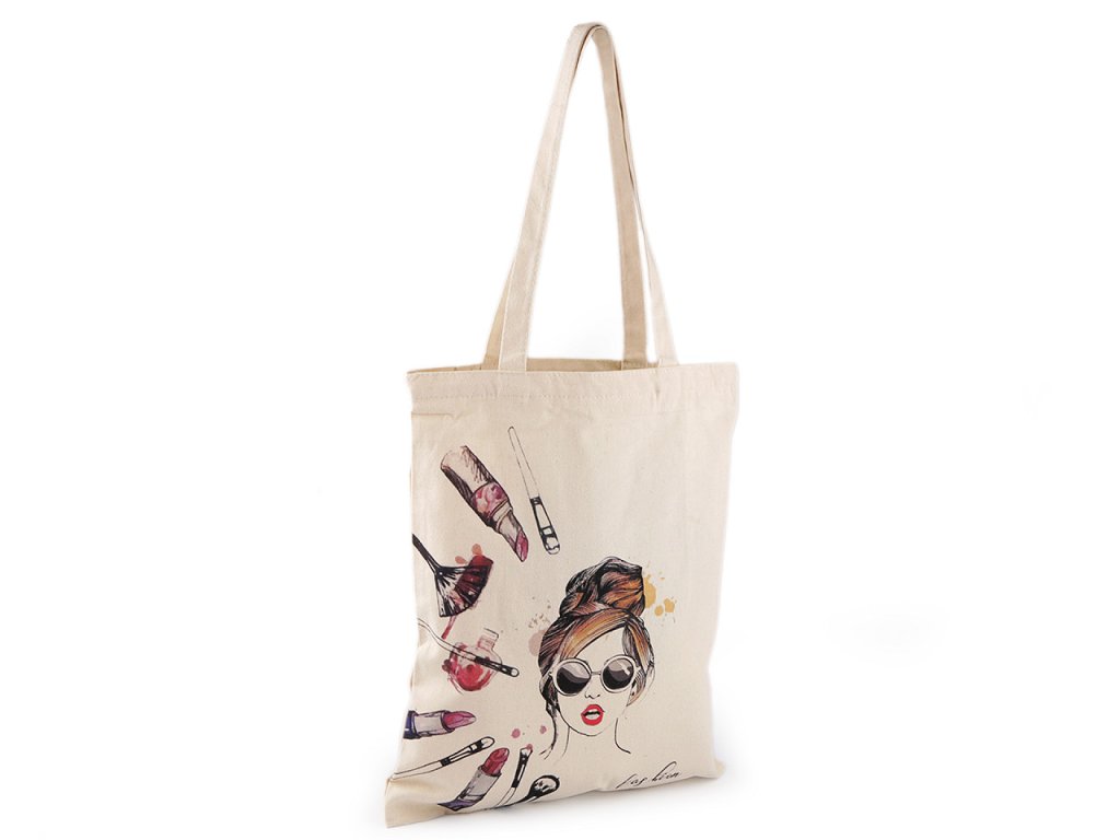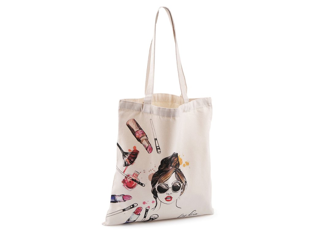 Textilní bavlněnou tašku z pevného hrubého materiálu zdobí na přední straně poutavé fashion motivy. Nemá podšívku, je vhodná na běžné nákupy.