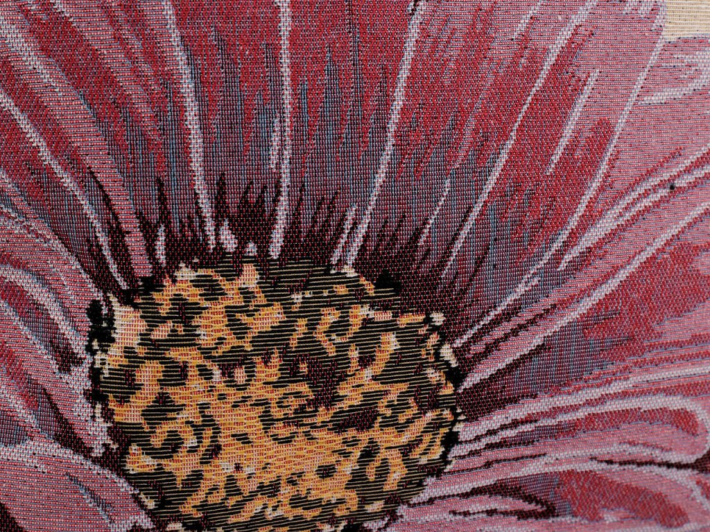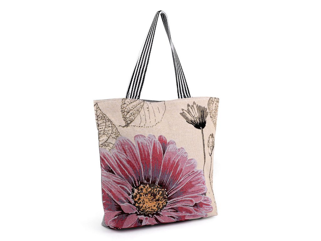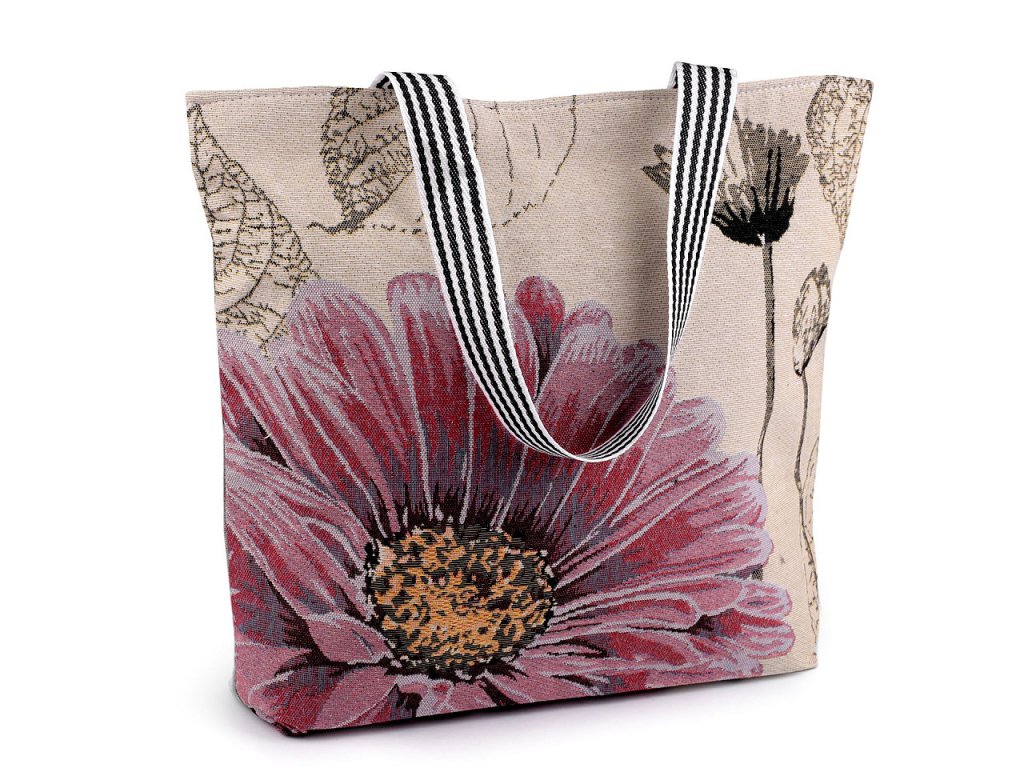 Bavlněná taška s motivem květů svým zpracováním napodobuje gobelínový vzor. Díky rozšířenému dnu je prostorná. Celá taška se uzavírá na zip, uvnitř má podšívku s kapsičkou na zip na drobnosti. Ucha tašky jsou pevná, široká 3,5 cm.