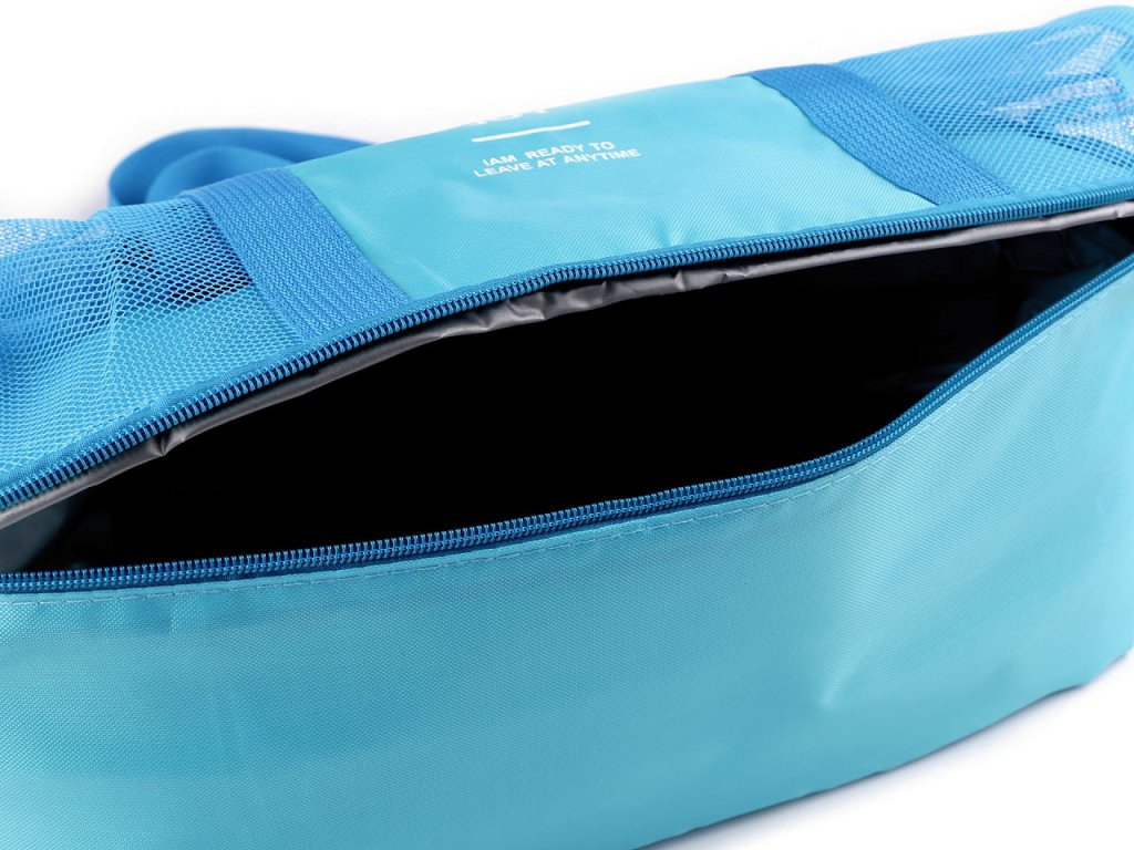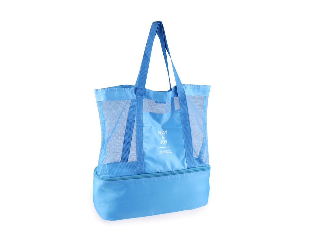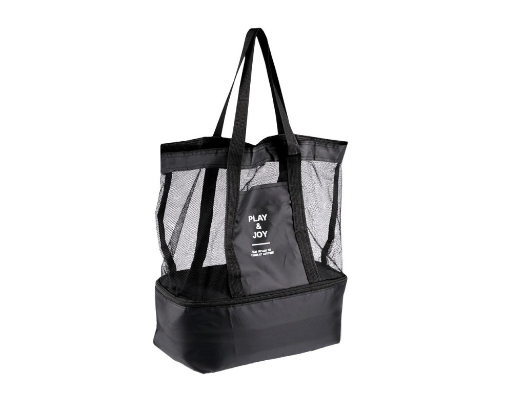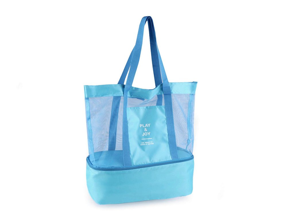 Velká síťovaná taška je lehká a prostorná, s rozšířeným dnem, ve kterém je navíc schovaný termobox. Taška má magnetické zapínání, dá se nosit i na pláž. Na přední straně má kapsu na uložení drobností, další malou kapsu najdete i uvnitř termoboxu. Ucha jsou určená k nošení v ruce.