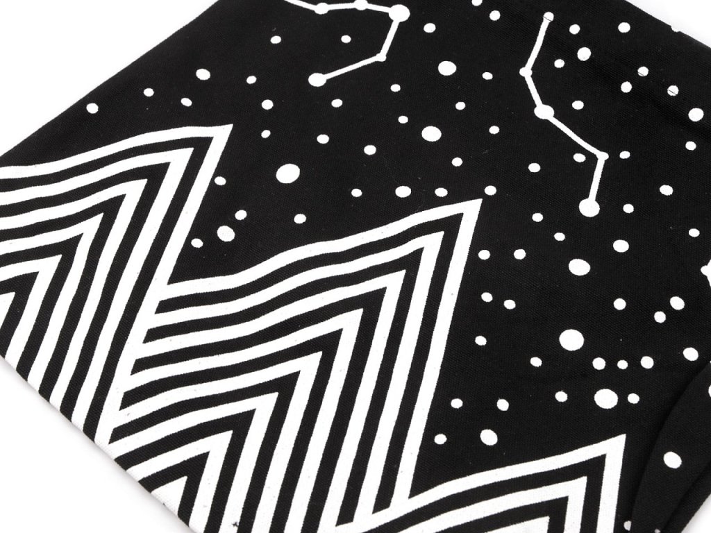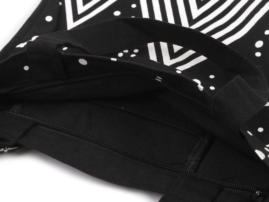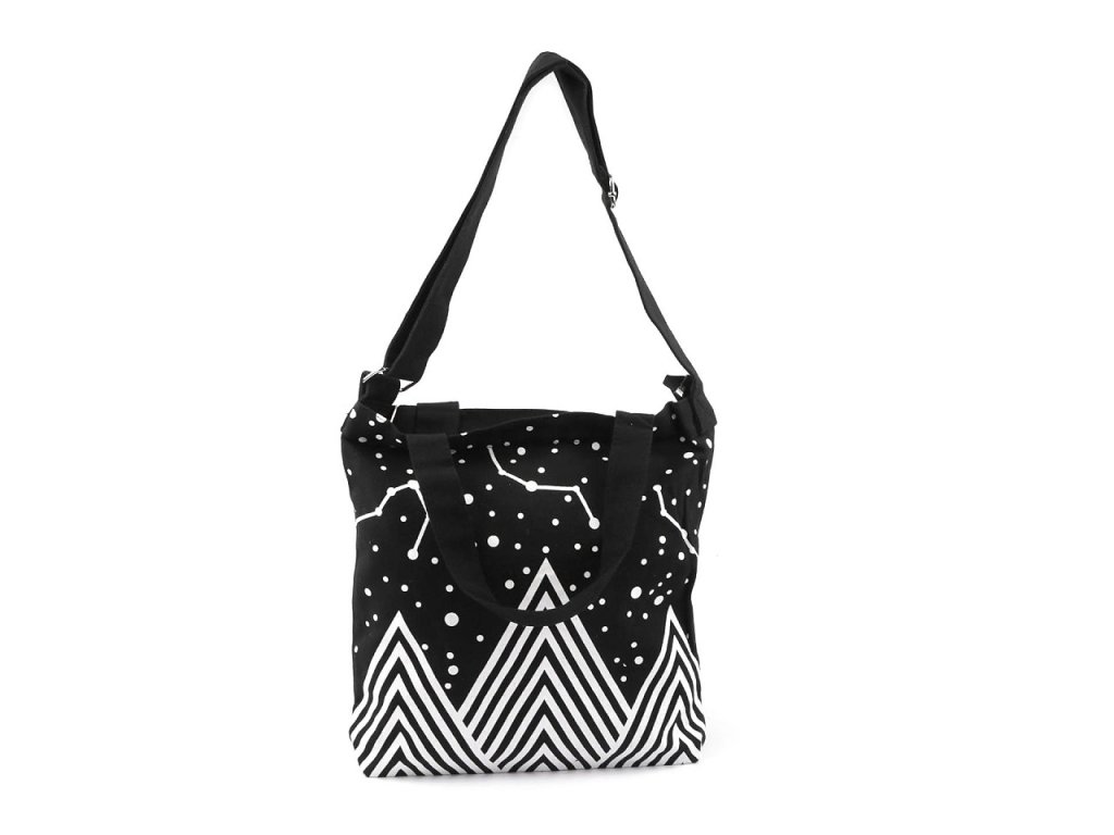 Bavlněná taška s potiskem pohoří je velice kvalitní, z hrubého plátna. Uzavírá se na zip. Uvnitř má kapsičku na drobnosti. Má ucha do ruky a popruh s plynulou regulací délky. Dno je rozšířené.