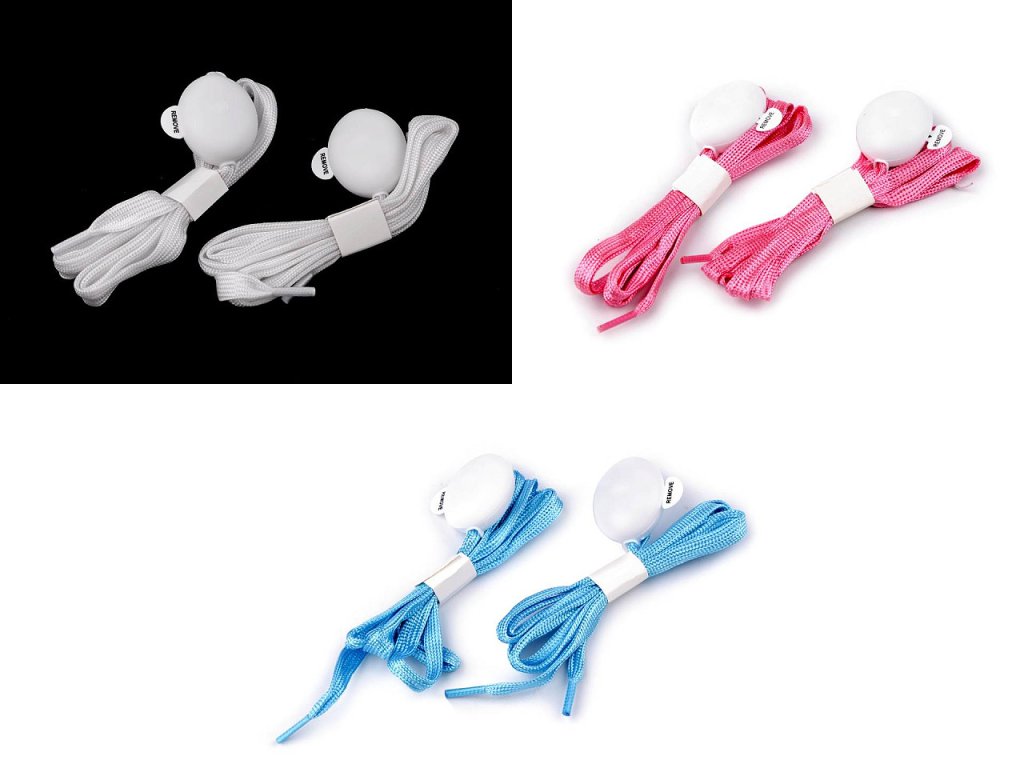 Svítící Led tkaničky do bot jsou nezbytným doplňkem nejen noční party. Jsou ploché, stačí je do boty navléci jako jiné tkaničky. Ocení je i děti, které mají rády světýlka v jakékoliv podobě. Zapínají se tlačítkem On/Off, mají 3 režimy svícení: svítí, blikají pomalu a blikají rychle.