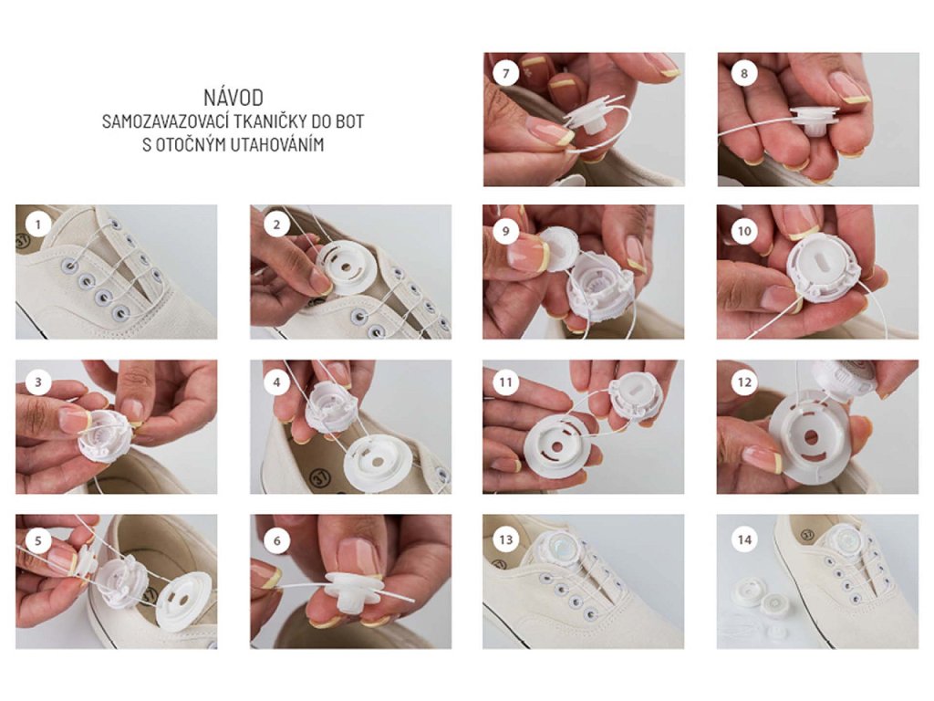 Revoluční tkaničky do bot, které nemusíte zavazovat. Otočný systém vám umožní bezpečné a rovnoměrné utažení bot bez nutnosti vázání tradičních uzlů. Dokonale se hodí do sportovní obuvi, trekingových bot nebo módních tenisek. Stačí je do boty navléci jako jiné tkaničky, oba konce protáhnout kolečkem, upravit na potřebnou délku a zajistit uzlíkem, kolečko secvaknout dohromady a můžete vyrazit.