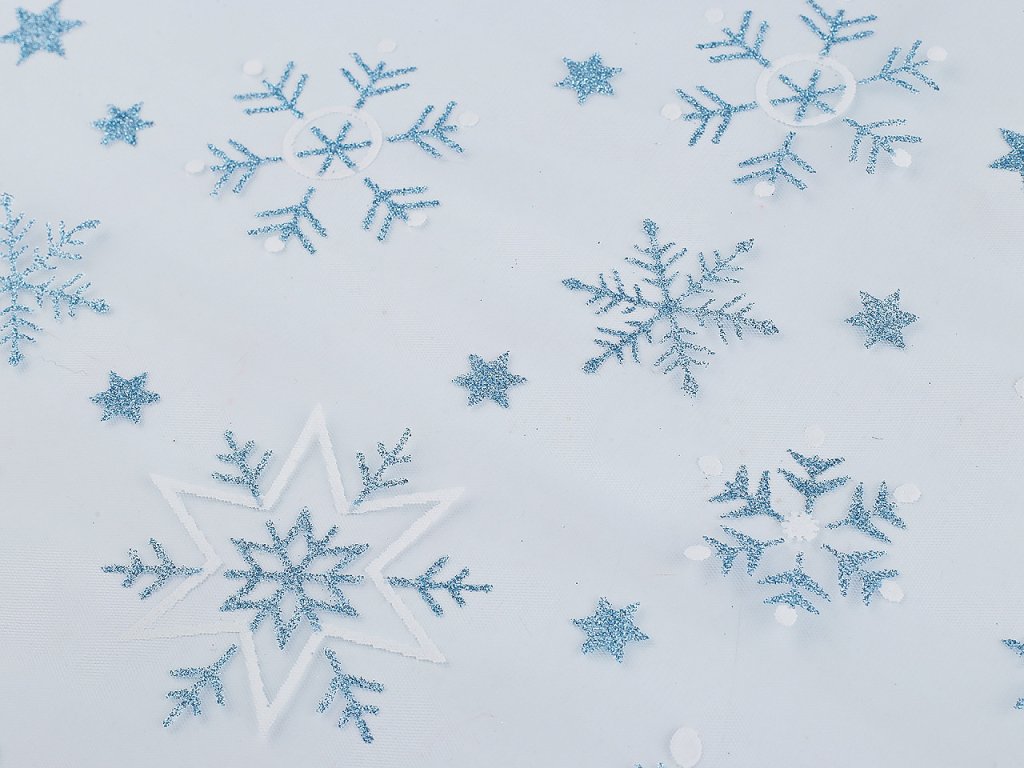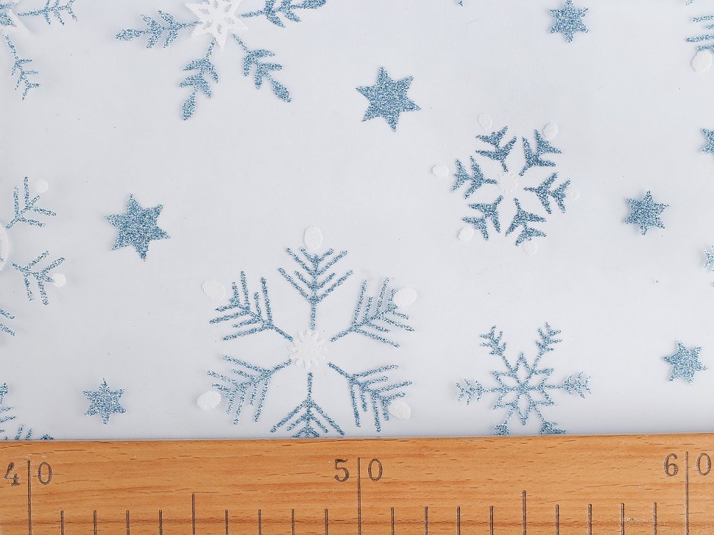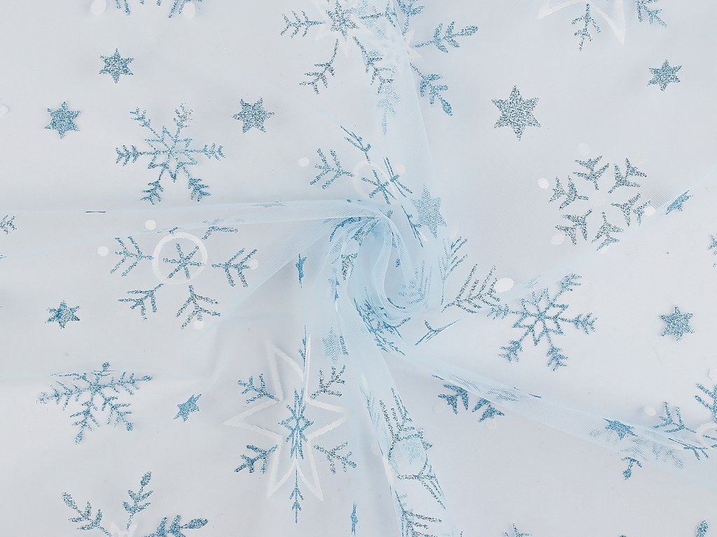 Vánoční tyl s potiskem vloček je jemný, měkký a pružný. Využijete ho na šití sukýnek, karnevalových kostýmů i různých dekorací a zimních aranžmá. Díky glitrům se efektně třpytí.