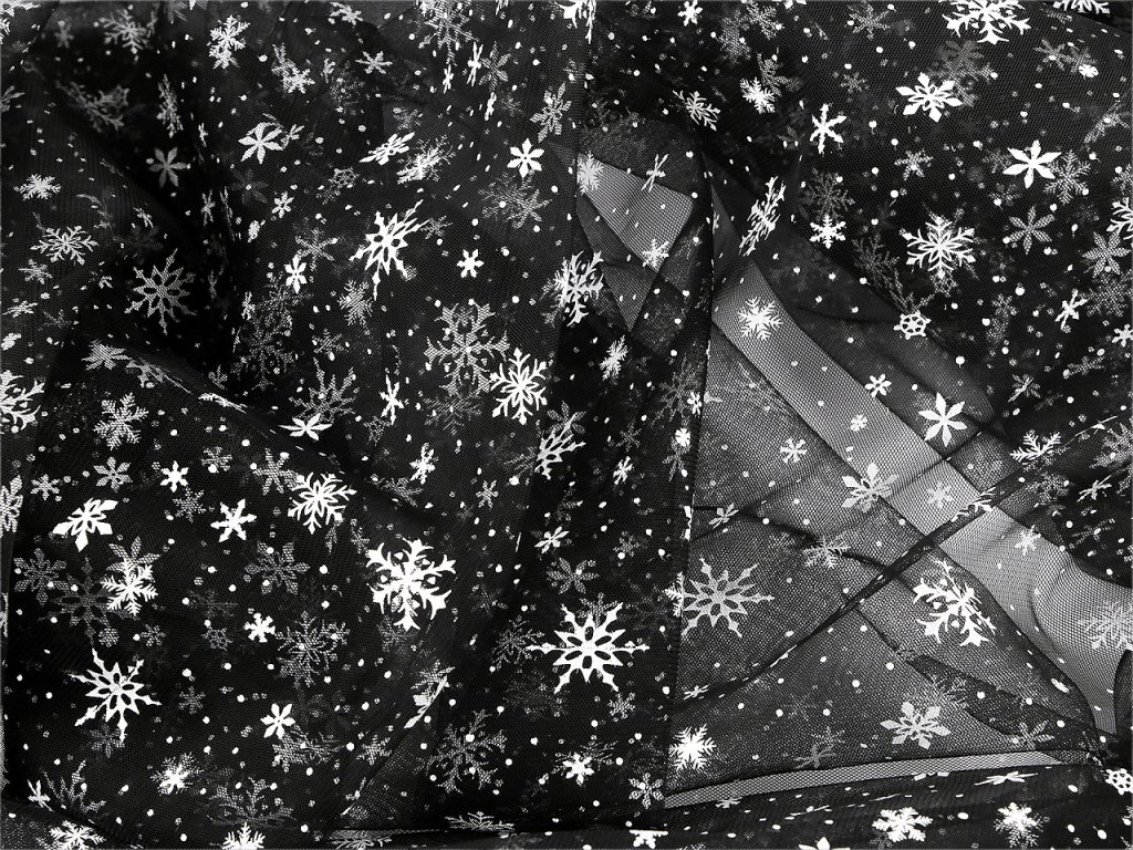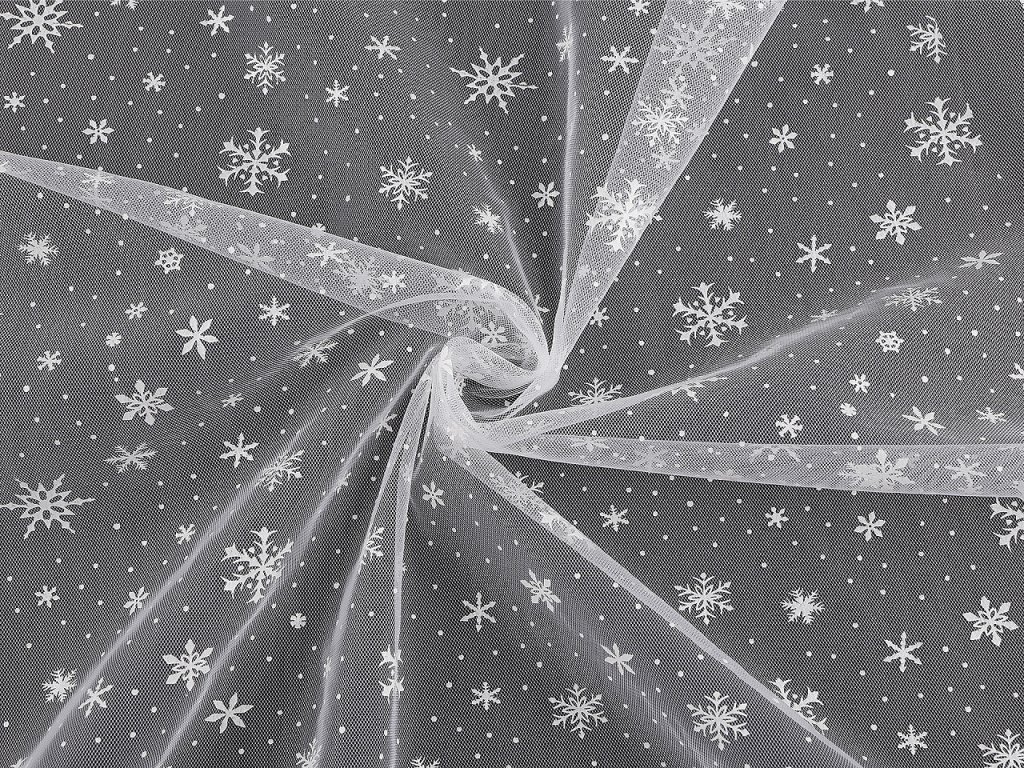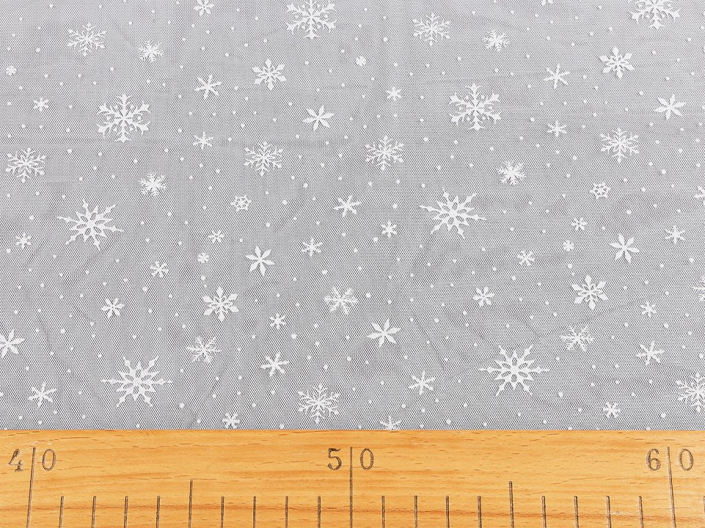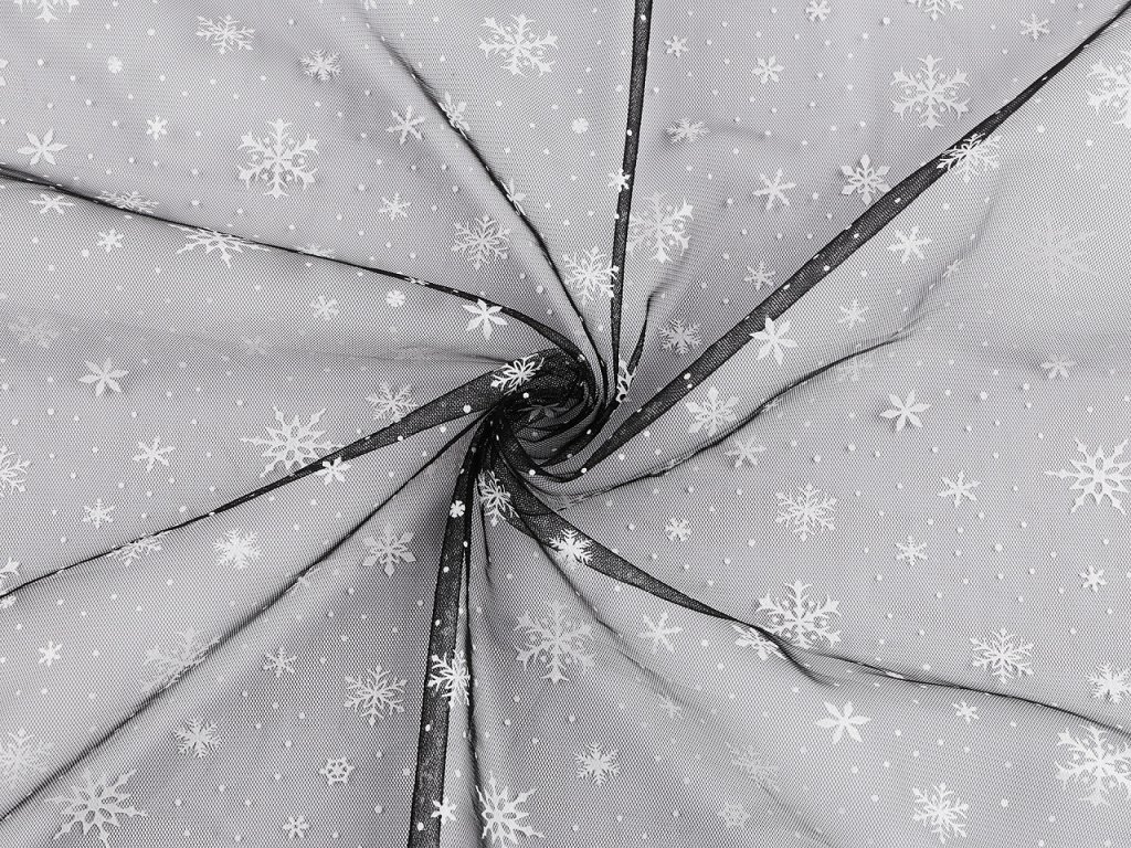 Vánoční tyl zdobí potisk bílých sněhových vloček. Je jemný, měkký a pruží více po šíři. Využijete ho na šití závojů, sukýnek, karnevalových kostýmů i různých dekorací a zimních aranžmá.
