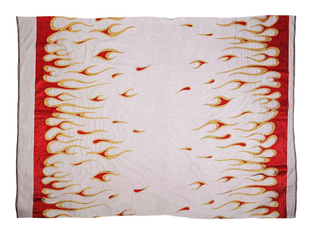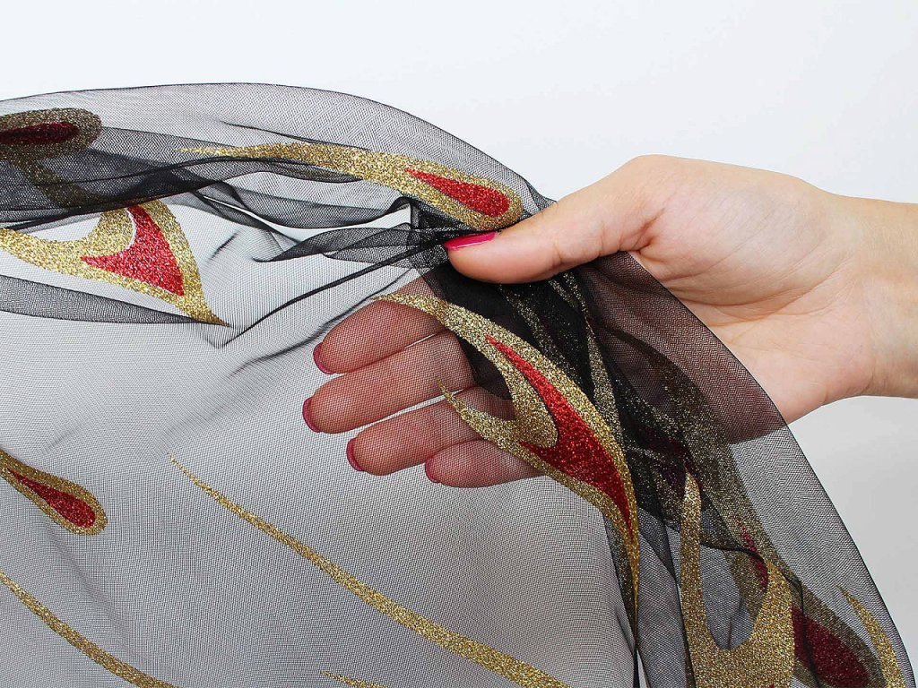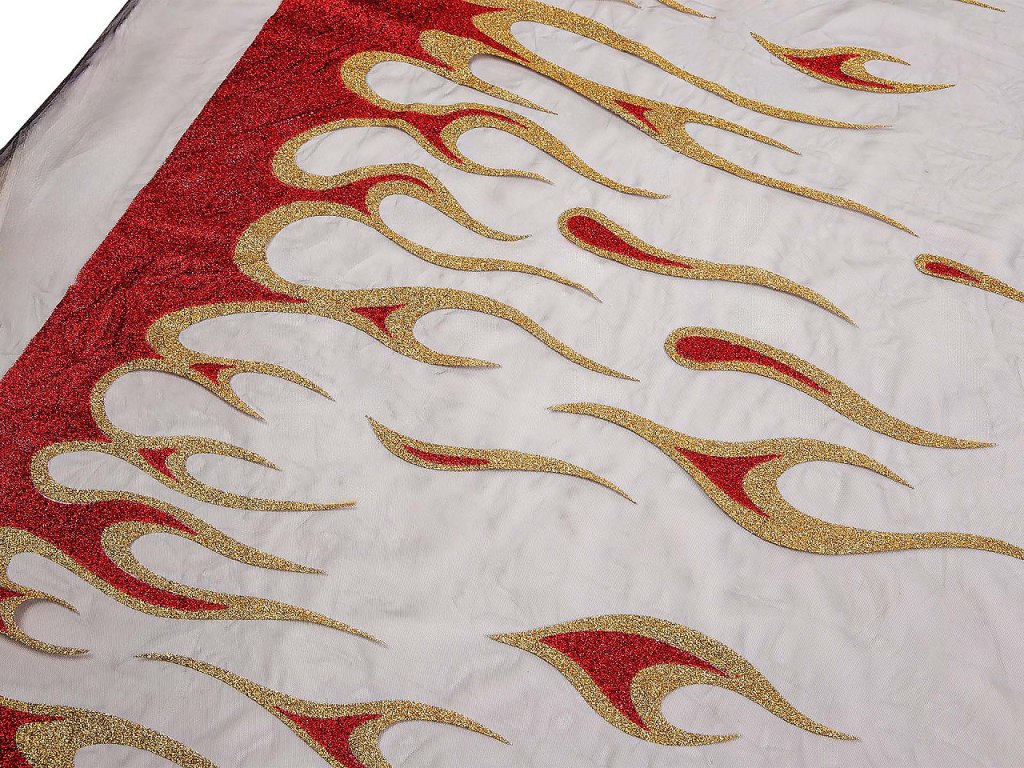 Oděvní tyl zaujme pozornost svým designem - po šíři na obou stranách je potisk glitrových plamenů, které se působivě třpytí. Tyl je jemný, ale v místě potisku je tužší.