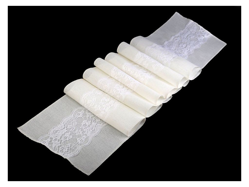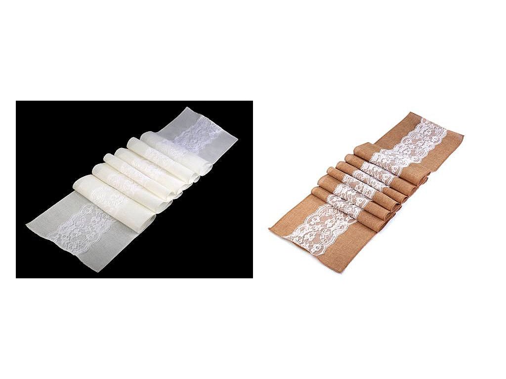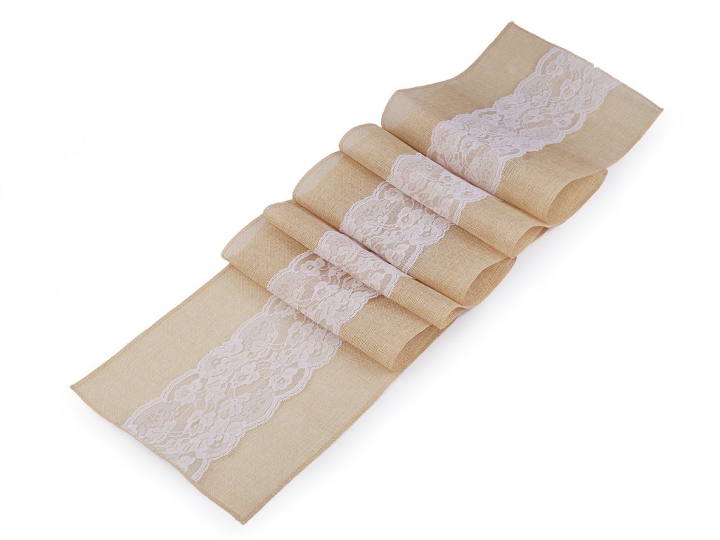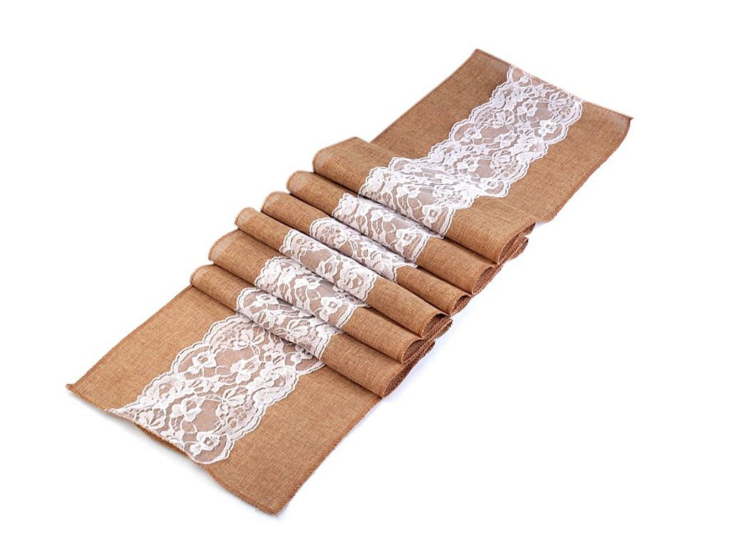 Vintage běhoun vám zútulní každý interiér. Připomíná jutu. Jeho střed zdobí romantická jemná krajka. Běhoun slouží k ozdobení středové části stolu. Mimo domov ho využijete i na svatbách a oslavách.