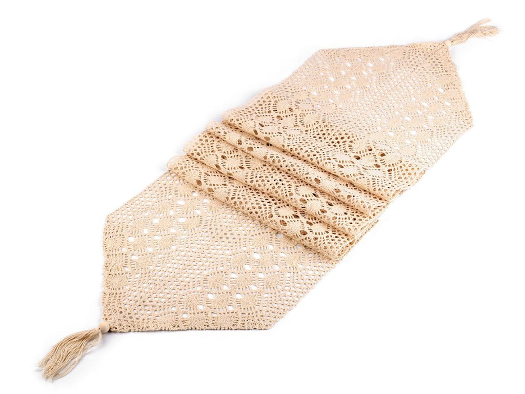 Běhoun z paličkované krajky poslouží k ozdobení středové části stolu. Využijete ho nejen doma, ale i na svatbách a různých oslavách ve vintage nebo boho stylu. Kratší strany má zakončené střapcem a dřeveným korálkem.