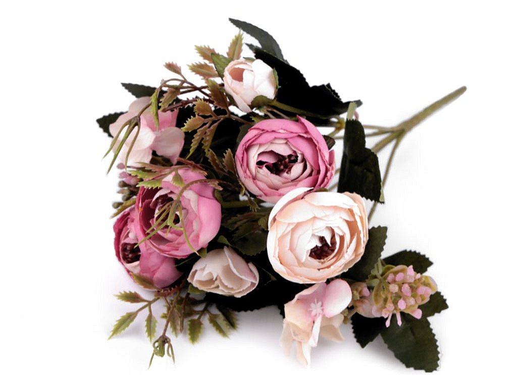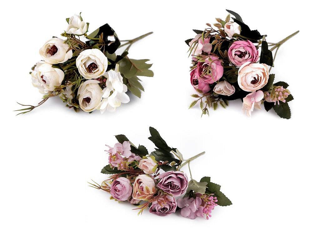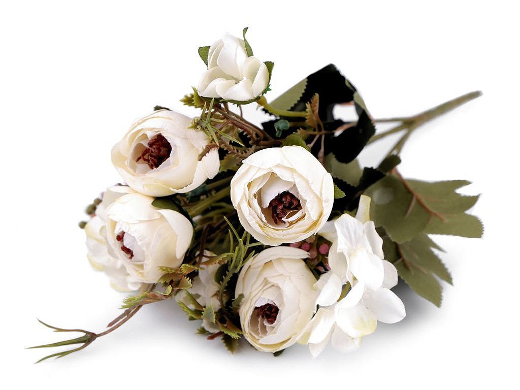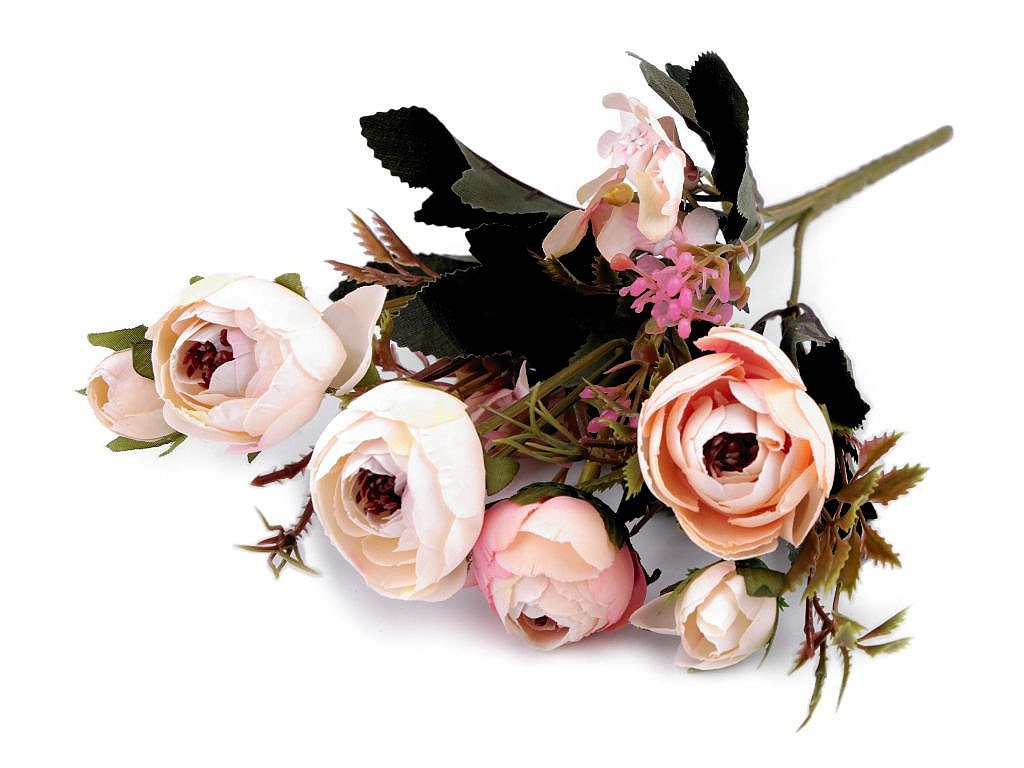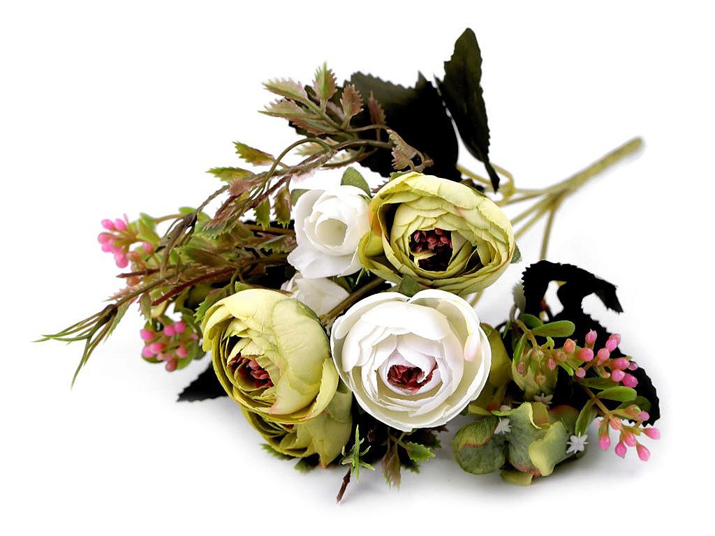 Umělý pryskyřník si snadno spletete s jeho živou předlohou, na rozdíl od ní, vám ale déle vydrží. Květy a lístky jsou textilní. V jednom svazku je 5 ohebných větviček s květy.
