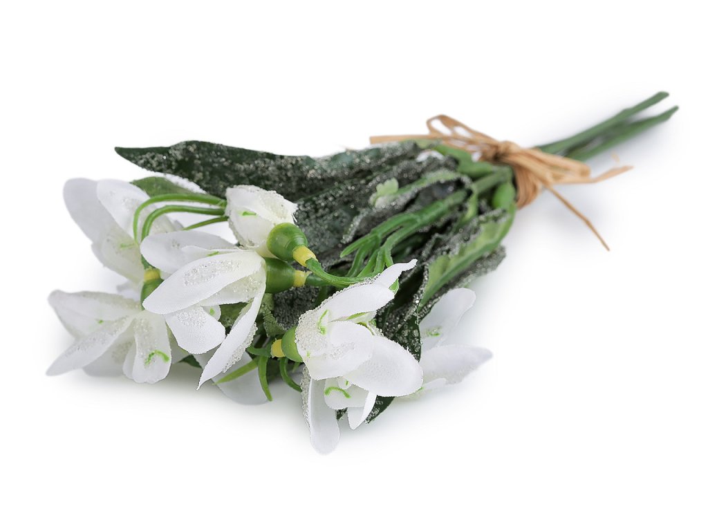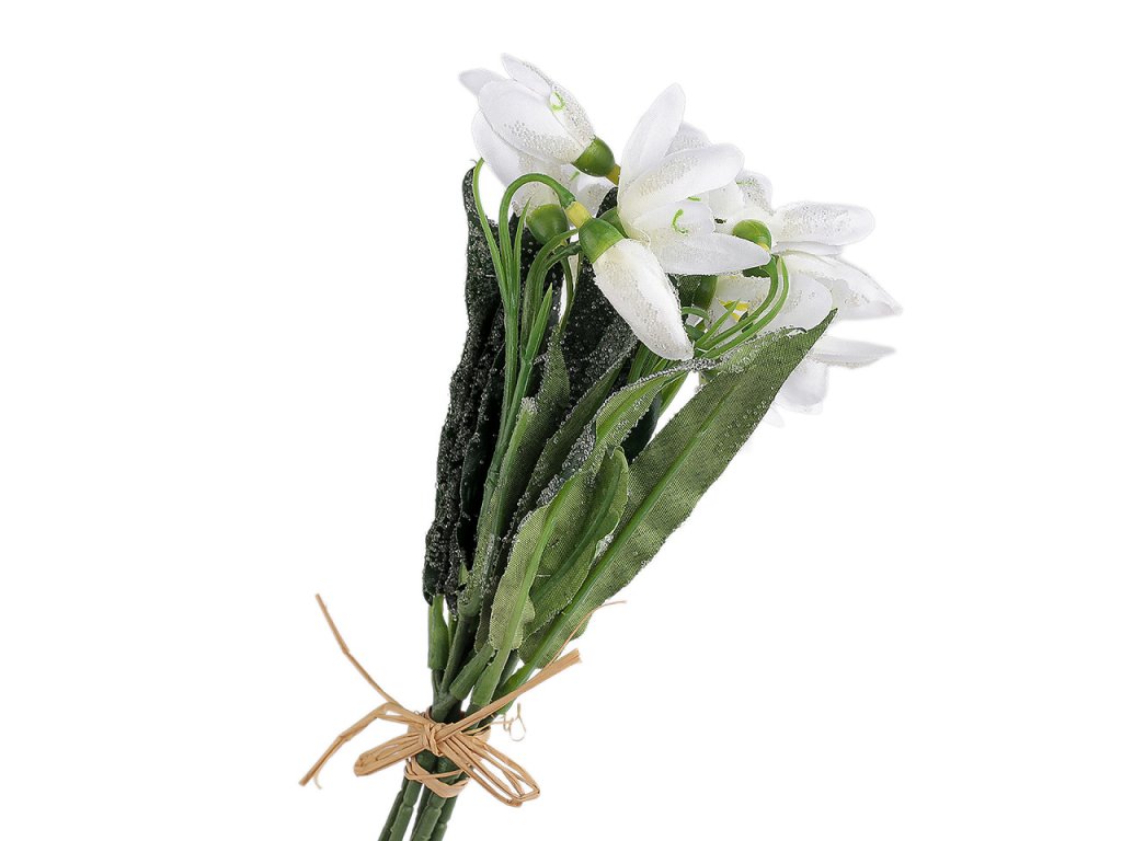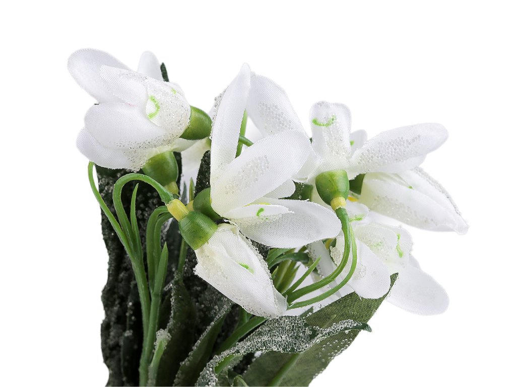 Svazek umělých sněženek vynikne ve váze, ale také v květinových vazbách, věncích a jarních aranžmá. Zajímavý efekt sněženkám dodávají drobné transparentní kuličky, které působí jako námraza. Uvnitř stonků je drát, který se dá tvarovat.
