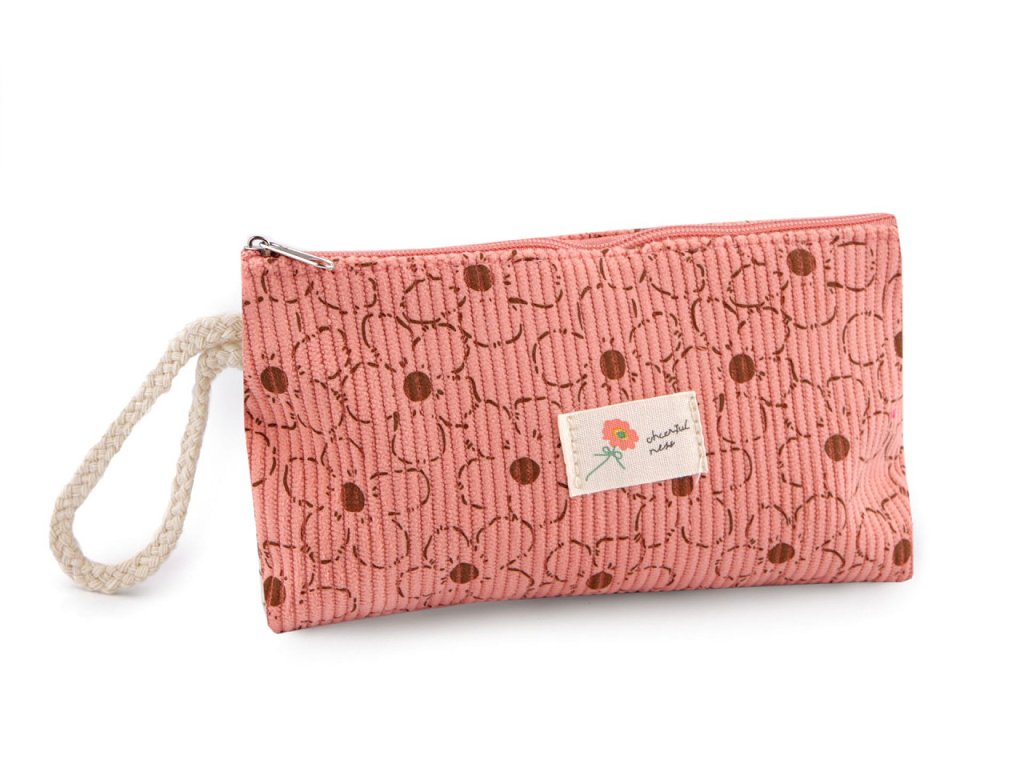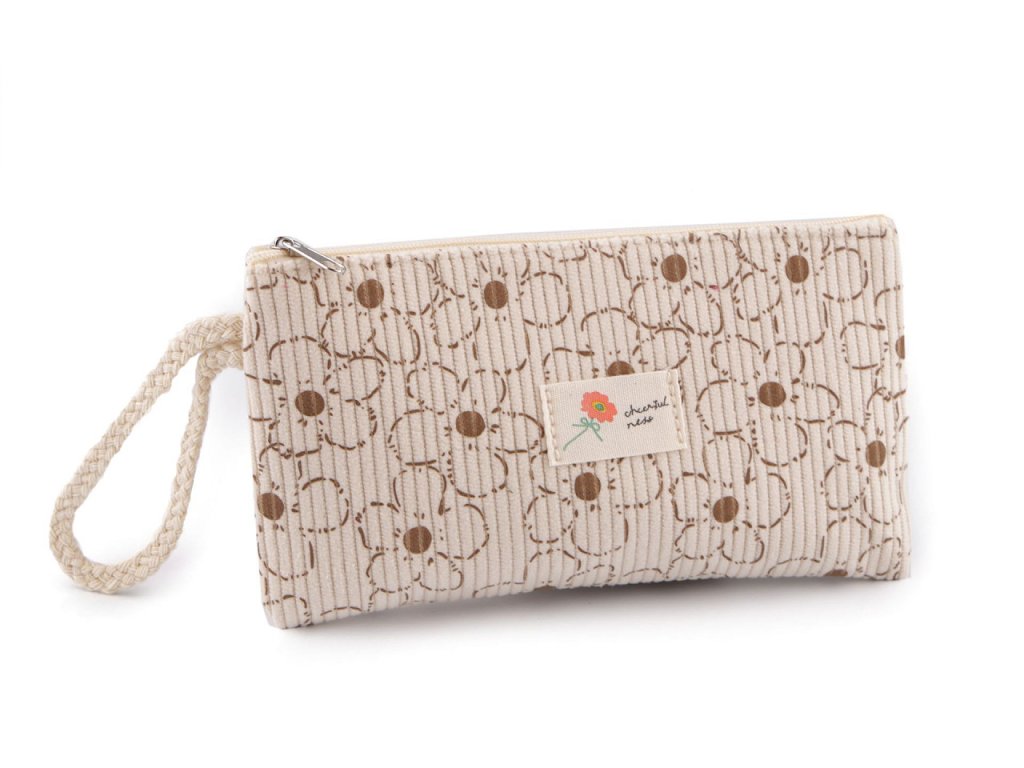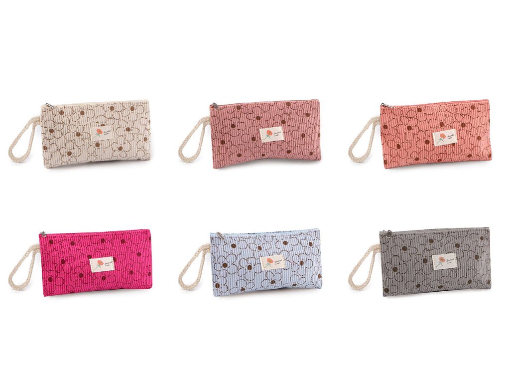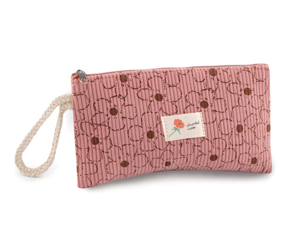 Textilní manšestrové pouzdro s designem květů je ideální na doma i cestování. Je dostatečně prostorné, vejde se do něj vše potřebné např. mobil, psací potřeby, brýle apod. Můžete jej použít i na kosmetiku. Praktické poutko usnadňuje manipulaci s pouzdrem, jeho přenášení i zavěšení. Na přední straně je ozdobené textilním štítkem, zapíná se na zip.