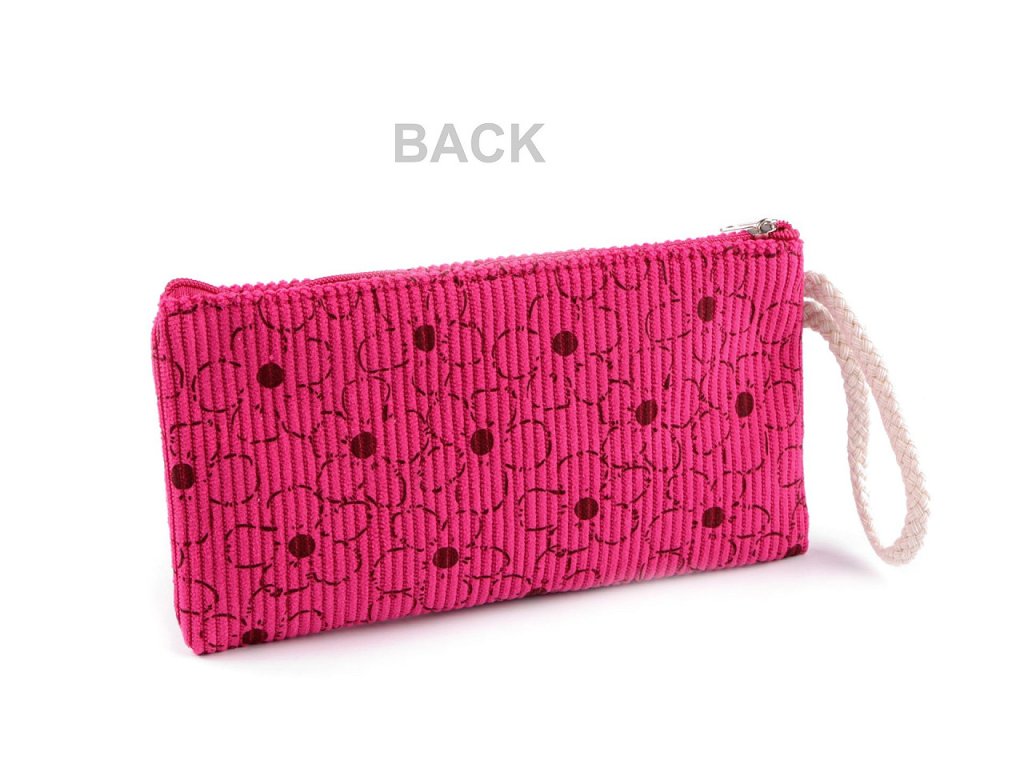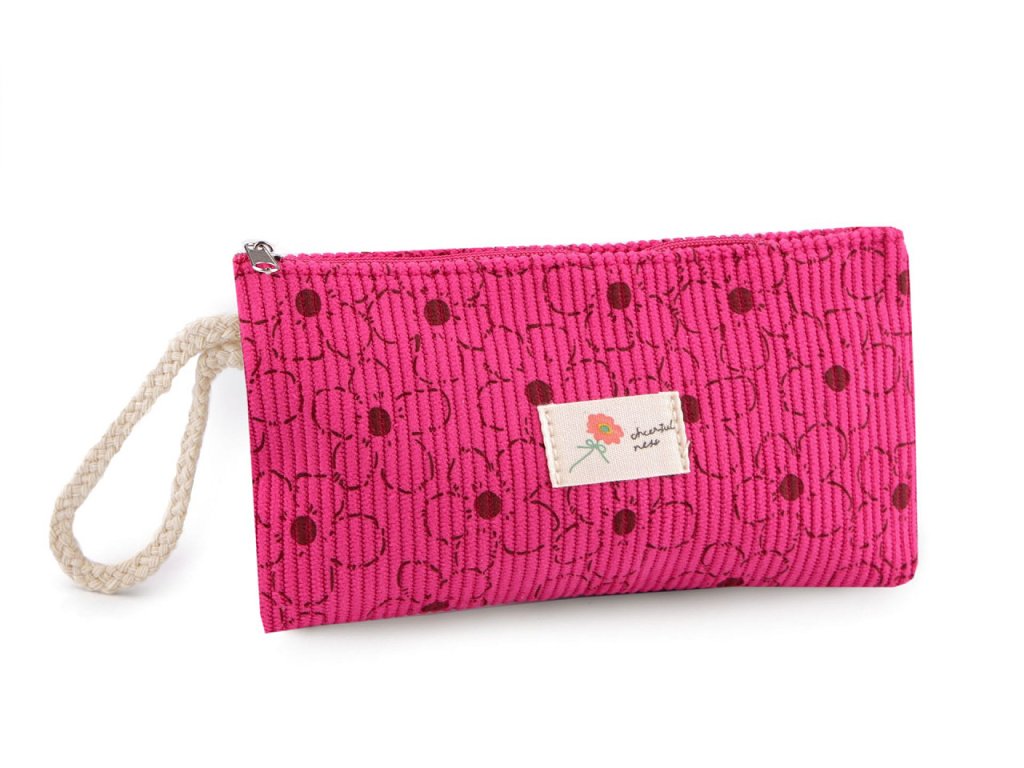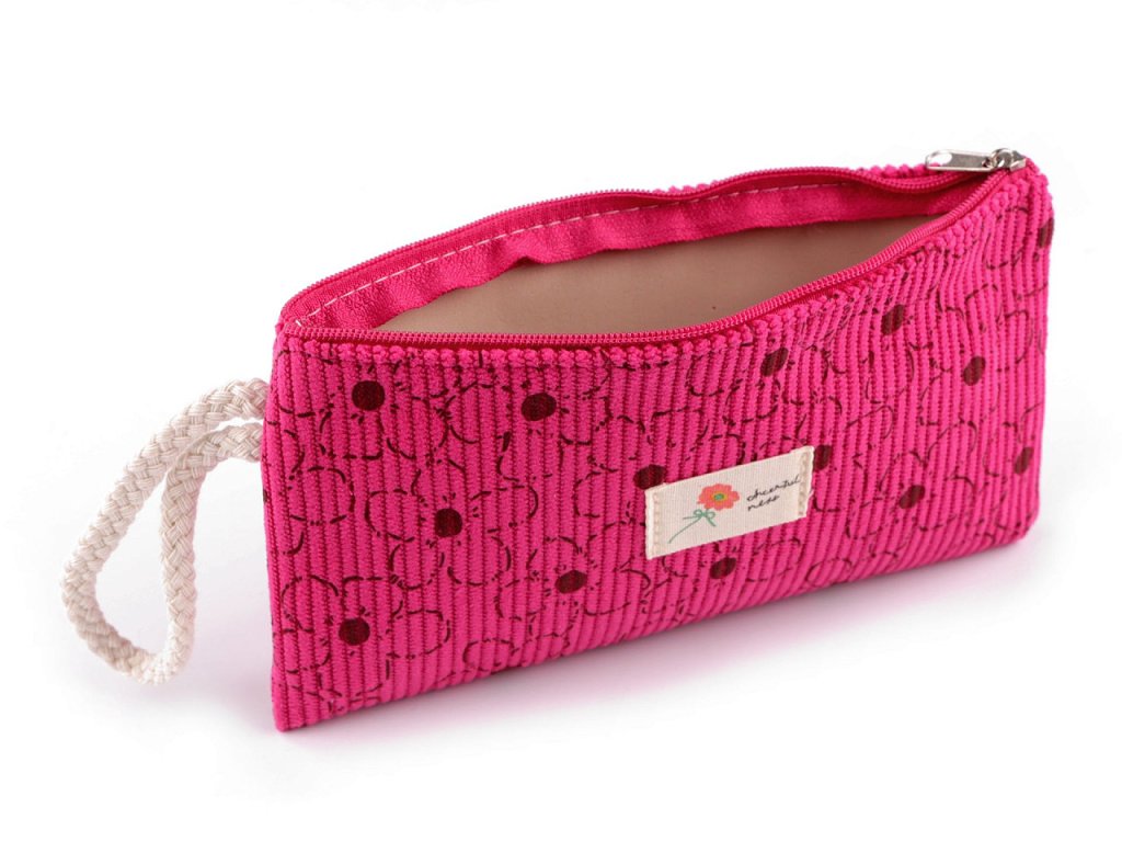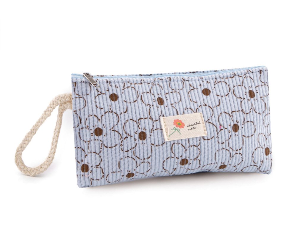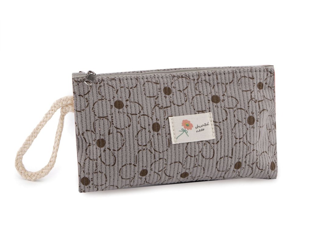 Textilní manšestrové pouzdro s designem květů je ideální na doma i cestování. Je dostatečně prostorné, vejde se do něj vše potřebné např. mobil, psací potřeby, brýle apod. Můžete jej použít i na kosmetiku. Praktické poutko usnadňuje manipulaci s pouzdrem, jeho přenášení i zavěšení. Na přední straně je ozdobené textilním štítkem, zapíná se na zip.