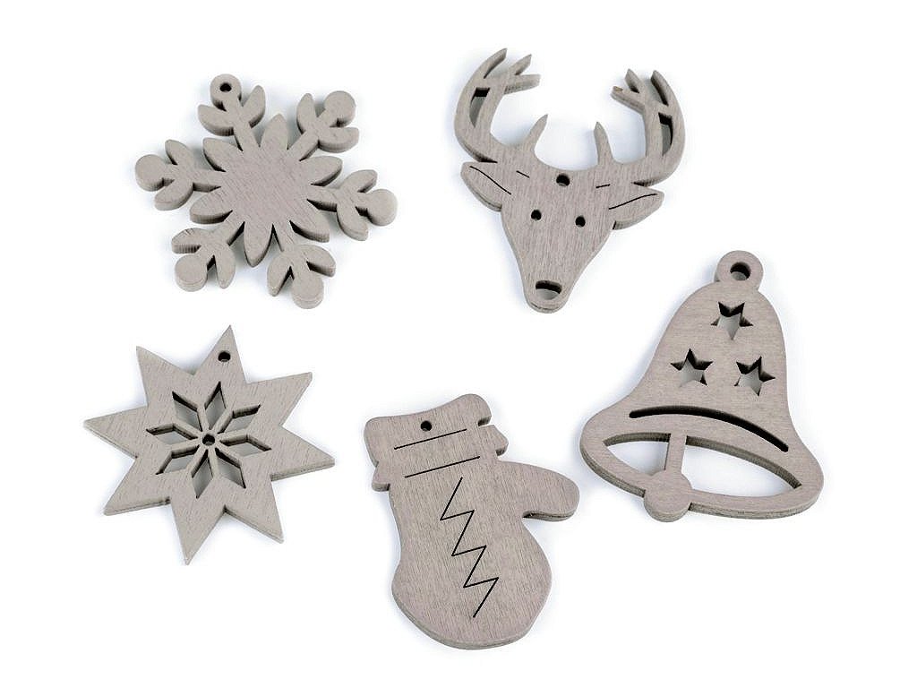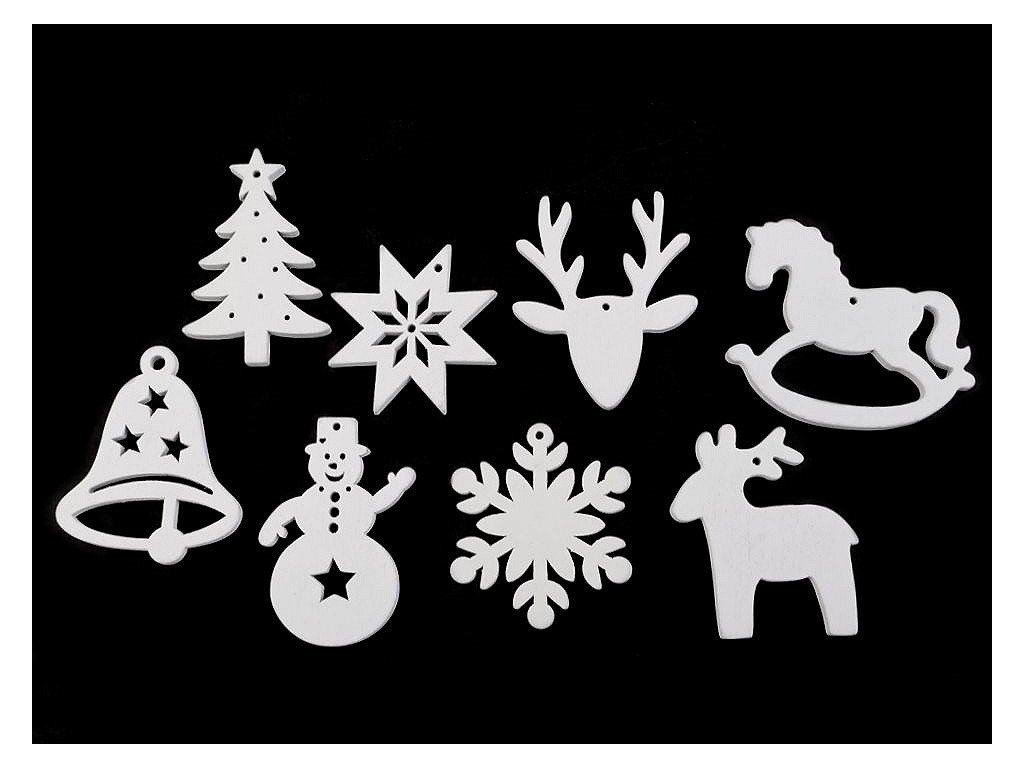 Dřevěné dekorace vnesou do každého interiéru vánoční náladu. V horní části mají dírku, do které se dá provléknout provázek nebo silon. Jednotlivé kousky můžete také nalepit na krabičky, věnce, rámečky apod. Parádu udělají i na dárcích.