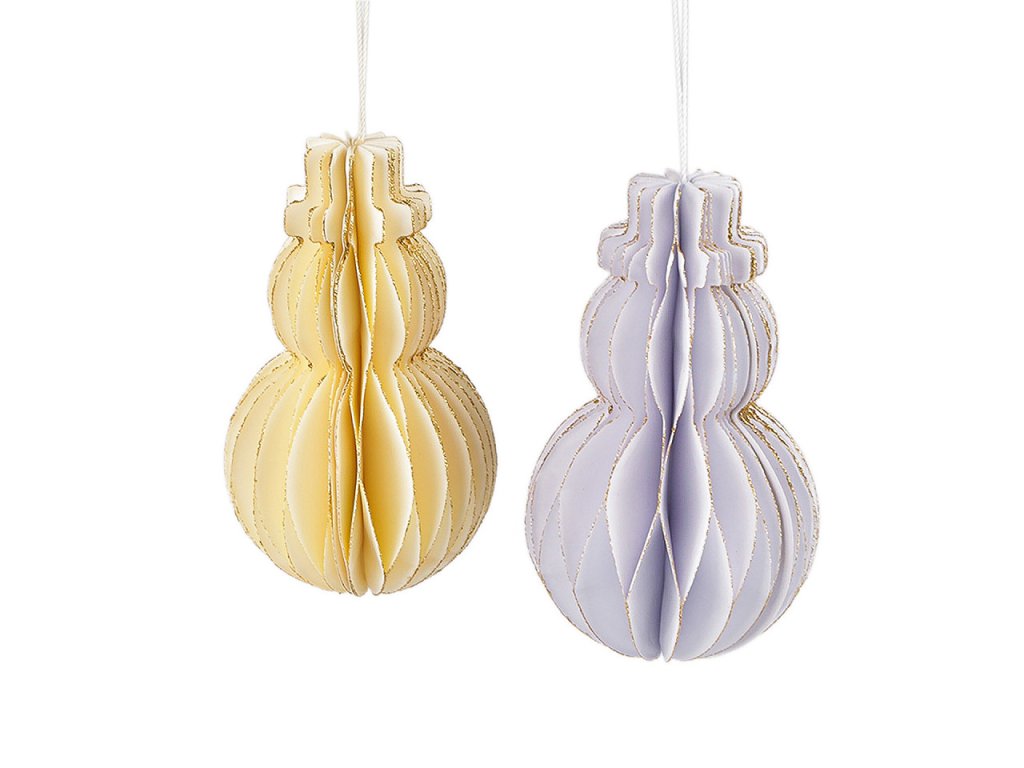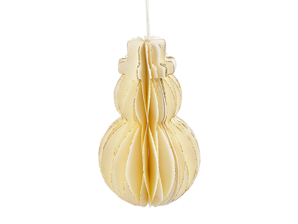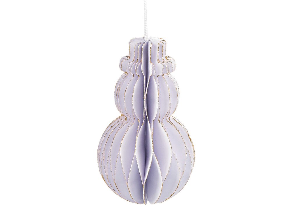 Závěsná dekorace ve tvaru sněhuláka je vyrobená z plástvového papíru, který při roztažení vytváří efekt připomínající včelí plástve. Tento druh papíru má zajímavý 3D efekt.