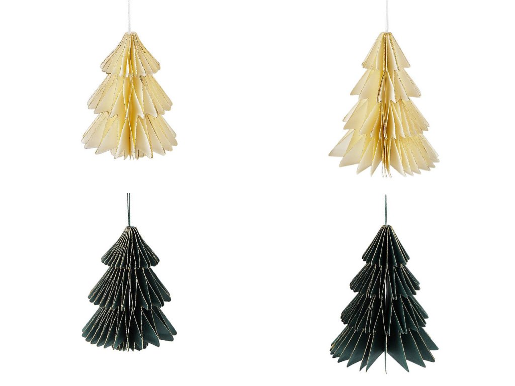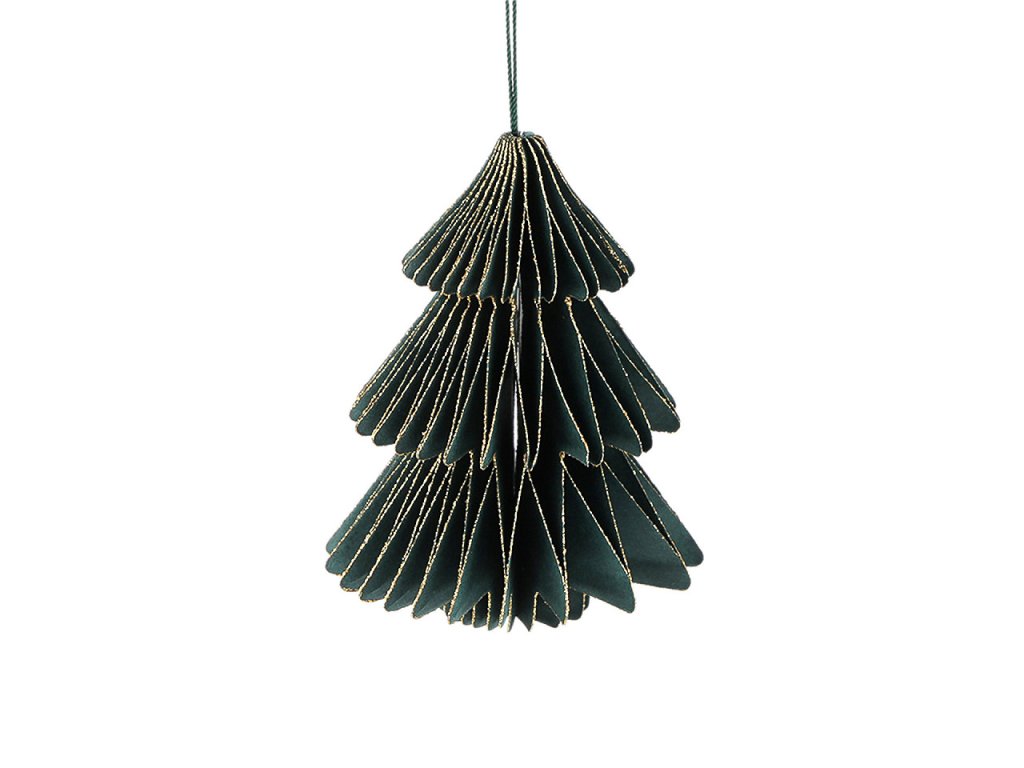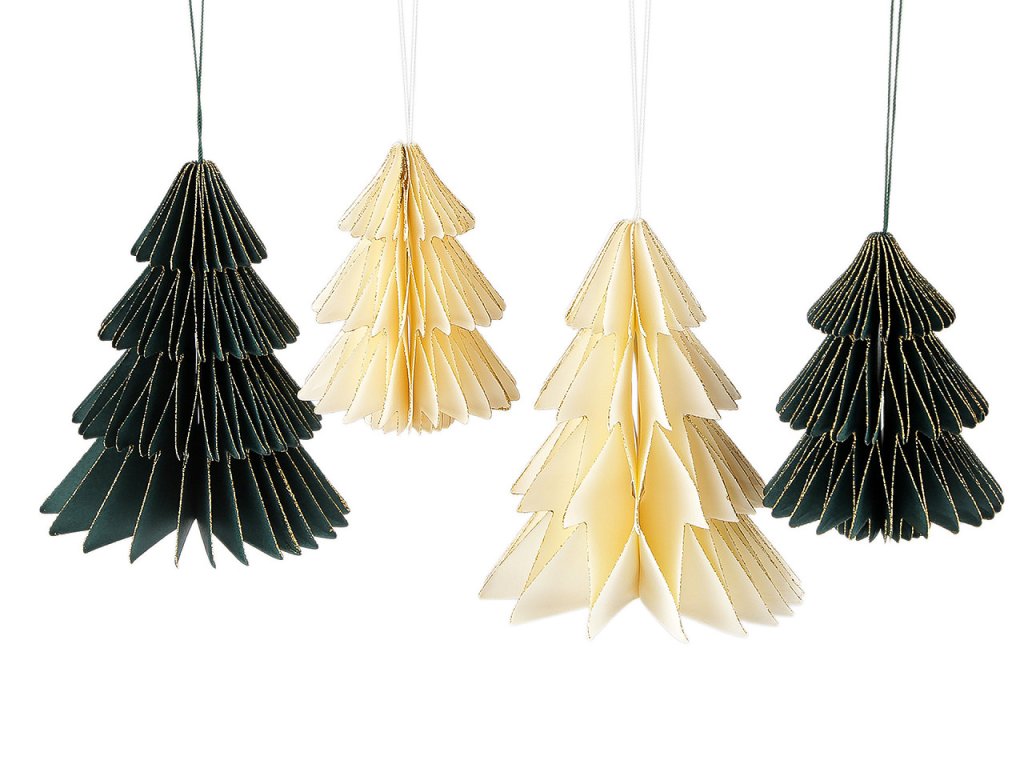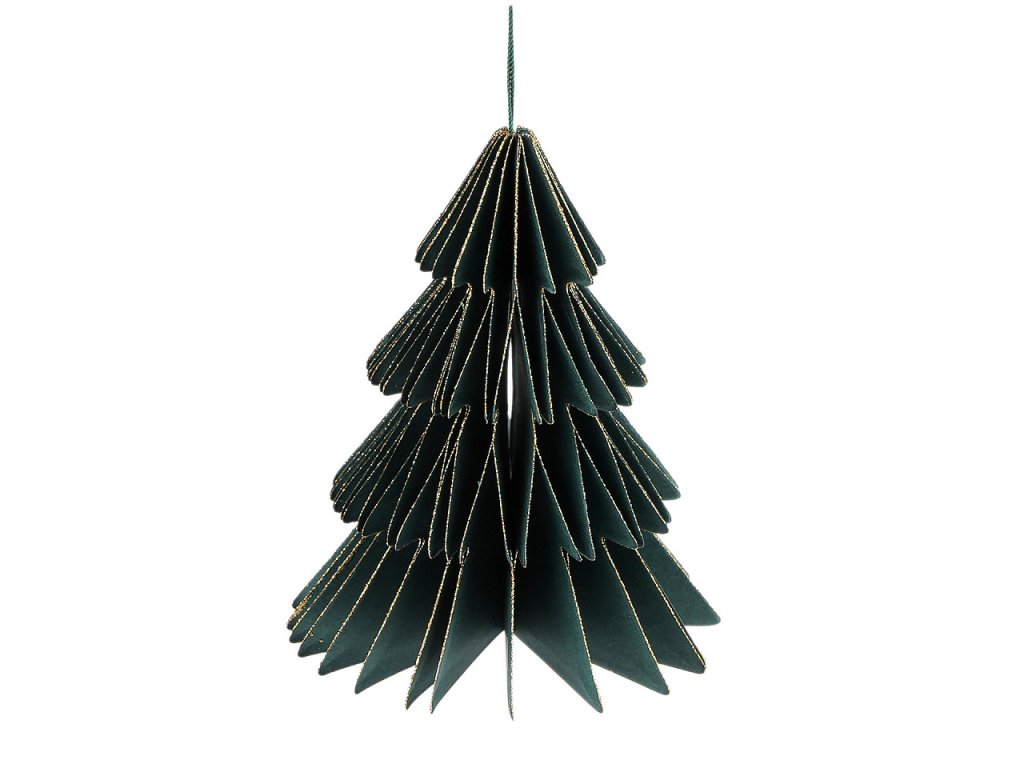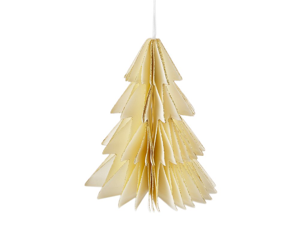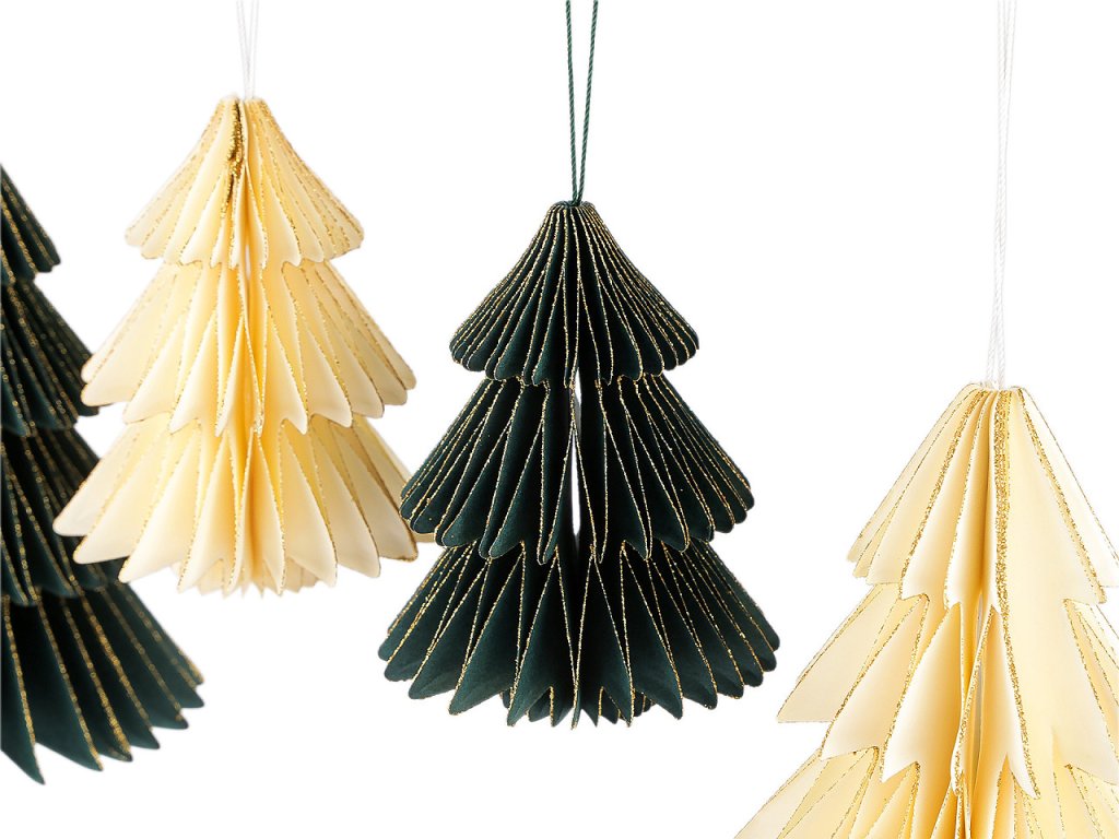 Závěsná dekorace ve tvaru stromečku je vyrobená z plástvového papíru a vytváří zajímavý 3D efekt. Díky poutku ho můžete pověsit na stromeček, větvičky ve váze nebo na věnce.