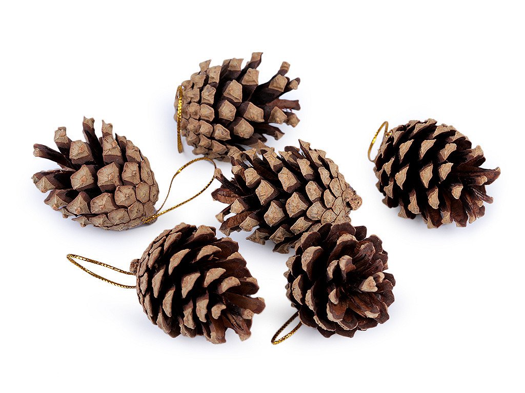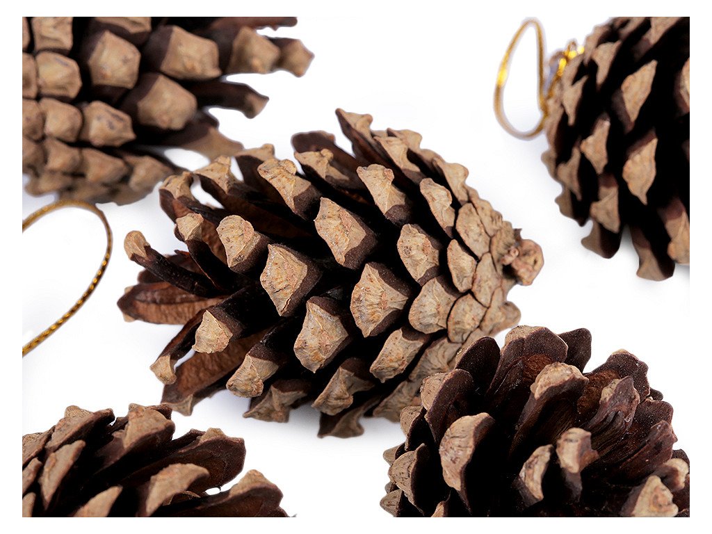 Dekorační šišky můžete pověsit na stromeček, věnce nebo větvičky ve váze. Mají poutko z lurexové šňůrky.