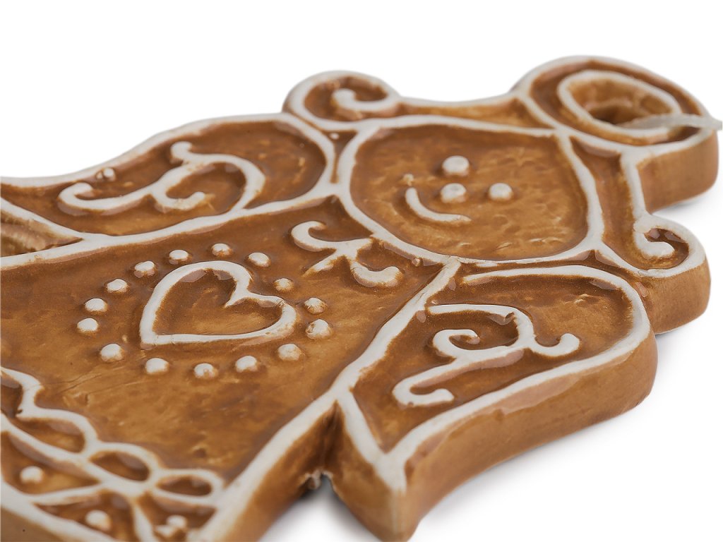Dekorační perníček v podobě andělíčka vyniká bílým dekorem a hravými detaily. Je jednostranně zdobený. Díky poutku ho můžete pověsit na vánoční stromeček, věnce nebo na zeď.