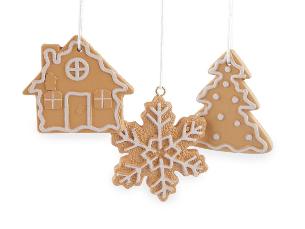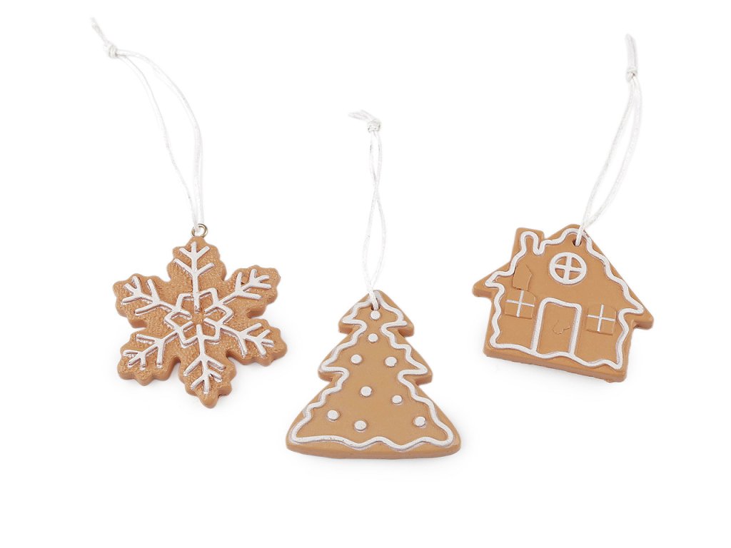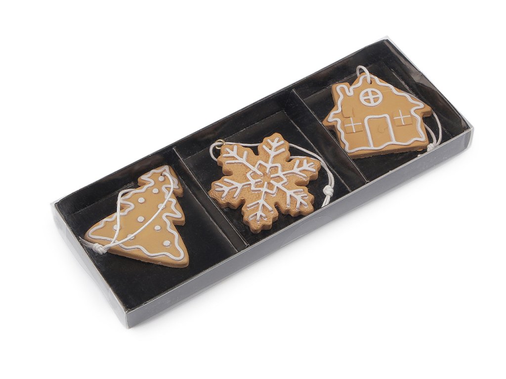 Dekorační perníčky ve tvaru domečku, stromečku a vločky zdobí jemný bílý dekor. Perníčky jsou jednostranně zdobené a opatřené praktickým poutkem pro snadné zavěšení na vánoční stromeček, věnce nebo jiná místa v domácnosti.