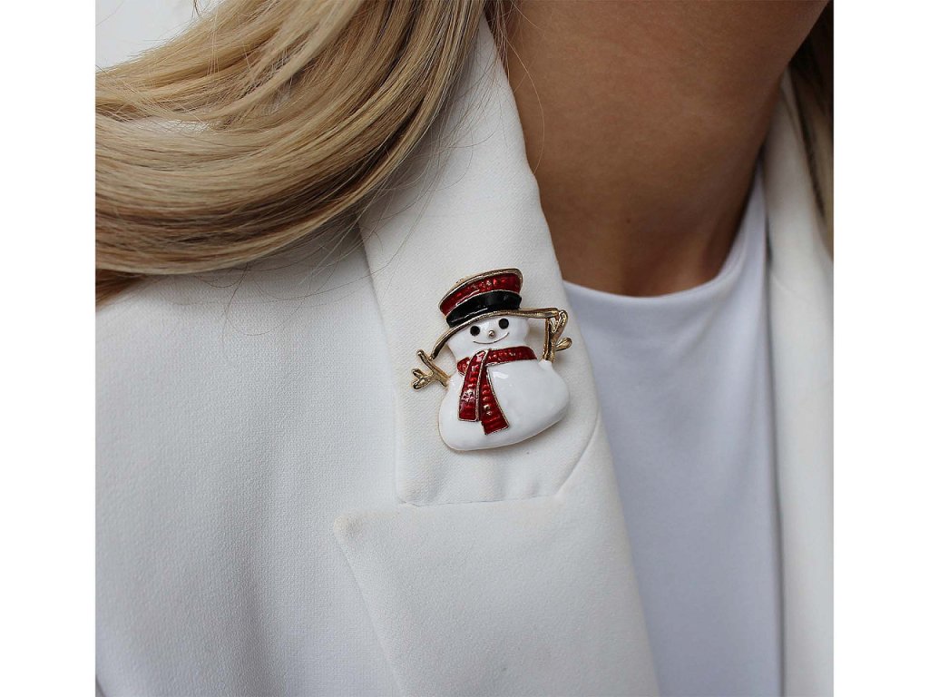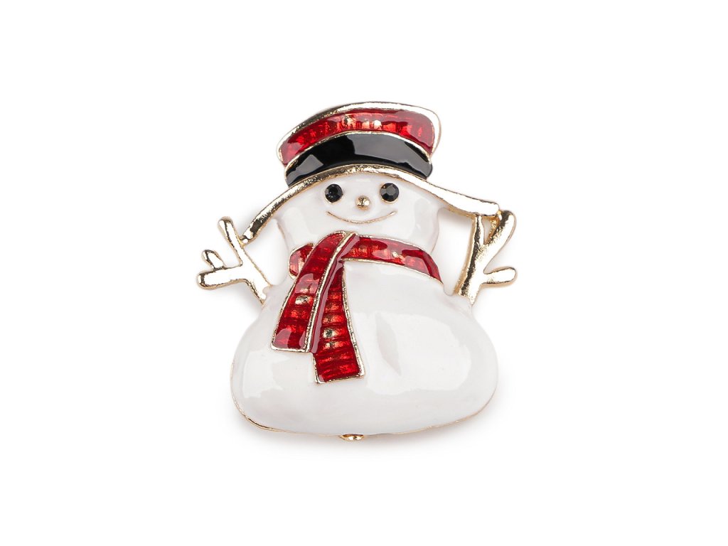 Vánoční brož se sněhulákem je ozdobená barevným smaltem. Bude stylovým doplňkem vašeho zimního outfitu. Skvěle dozdobí kabáty, saka, svetry, kabelky či čepice.