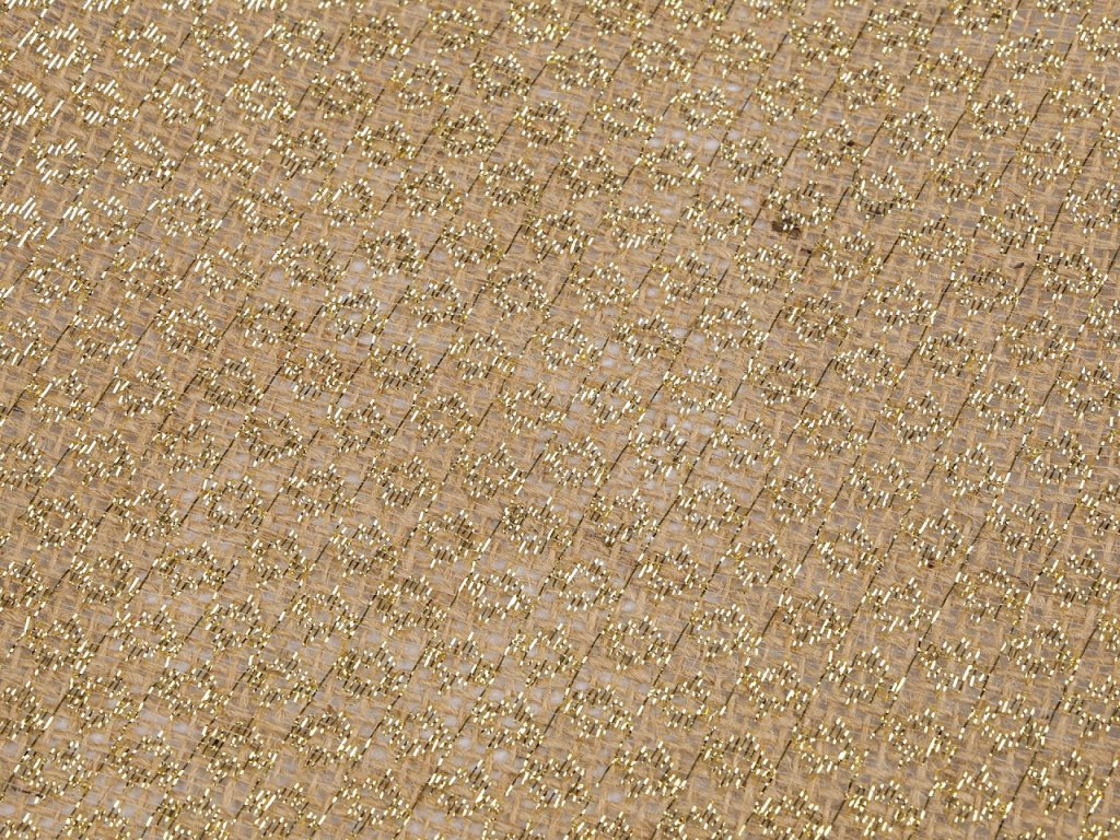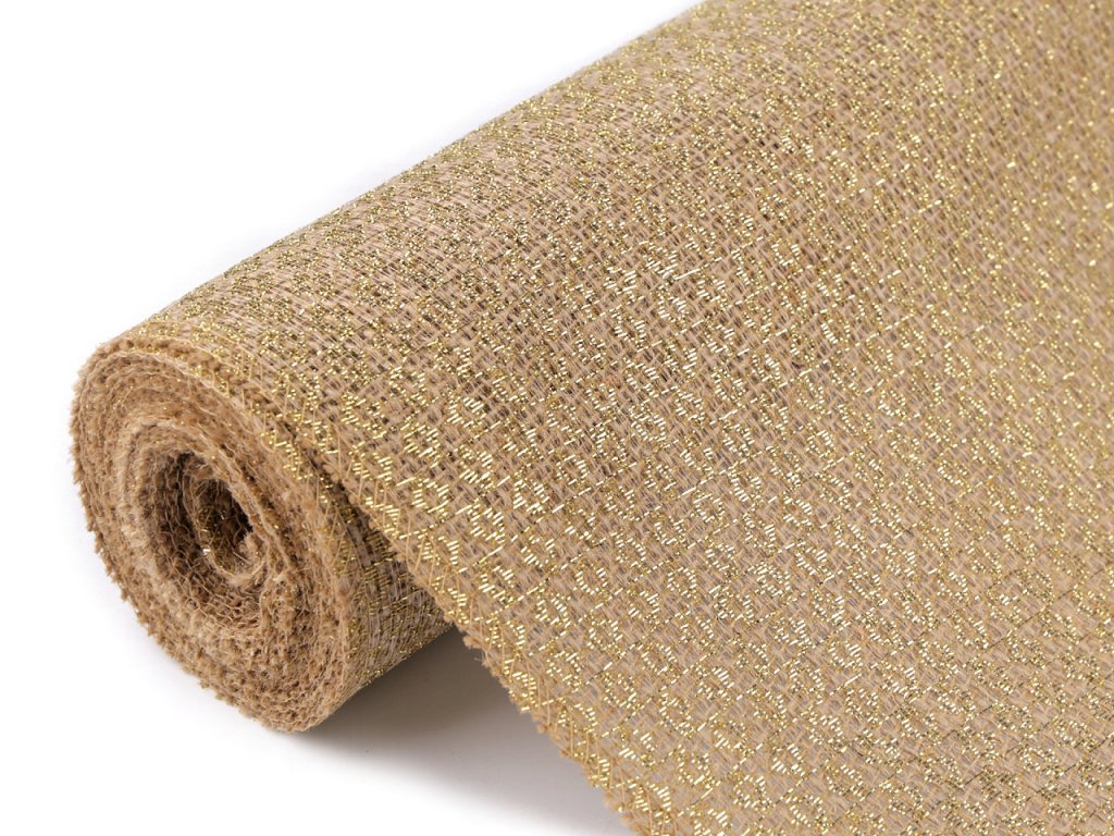 Přírodní juta je pevná, kvalitní a protkaná zlatým lurexovým vláknem. Okraje má obšité. Můžete z ní vyrobit běhoun, prostírání, různé dekorace a aranžmá.